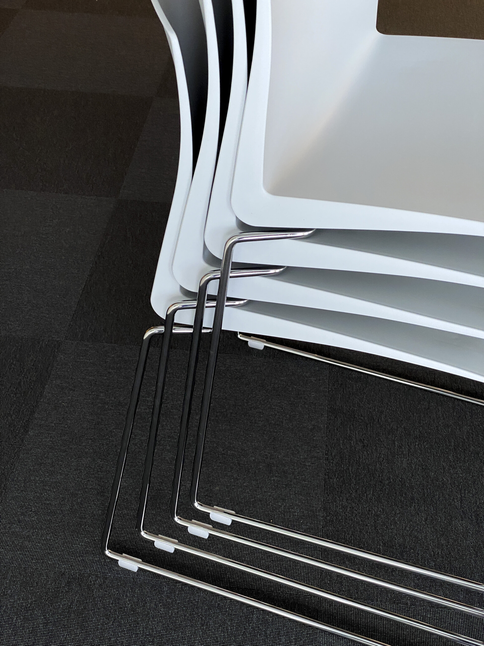 Seat and back in plastic (white). With stand in metal (chrome).