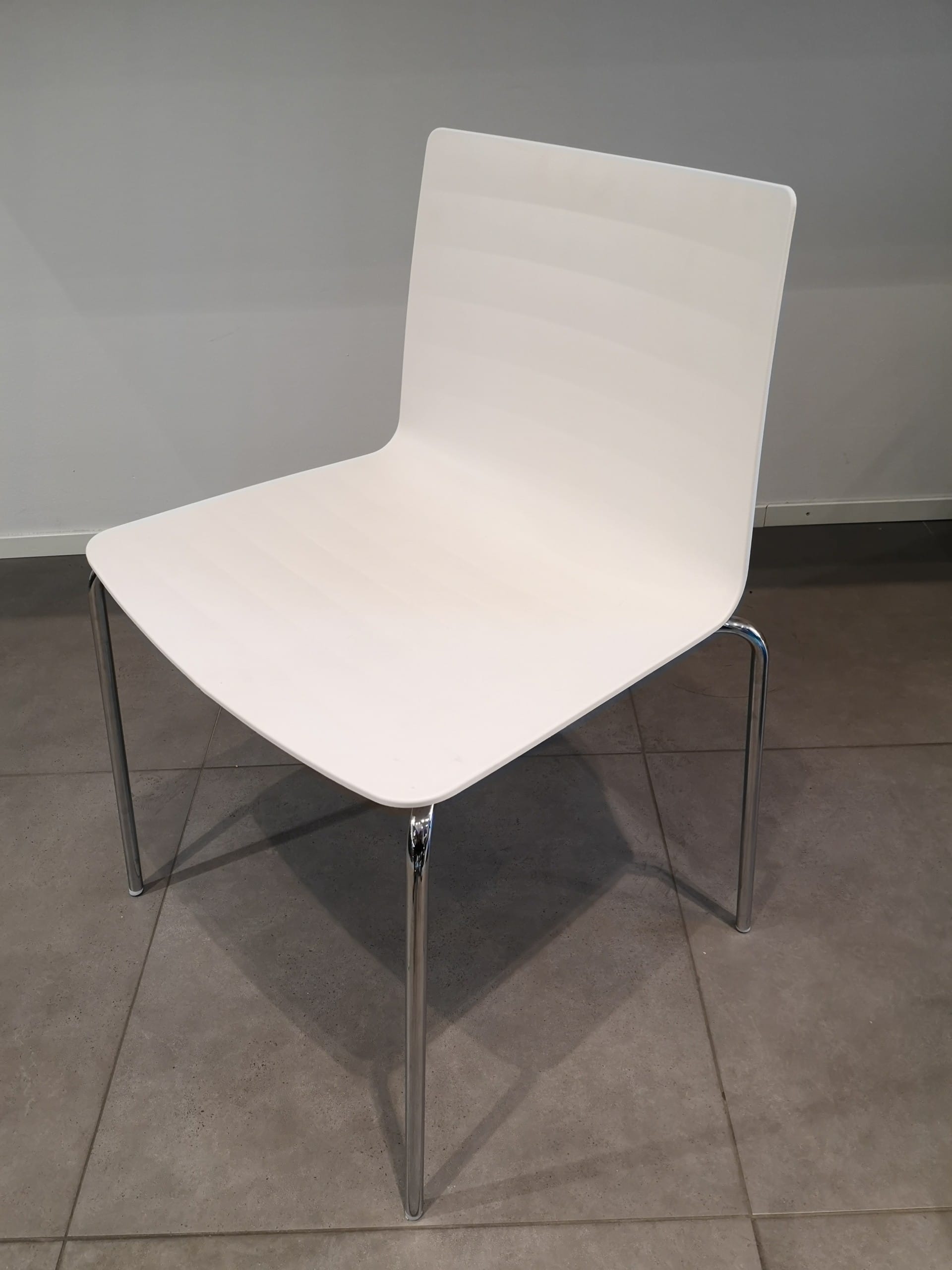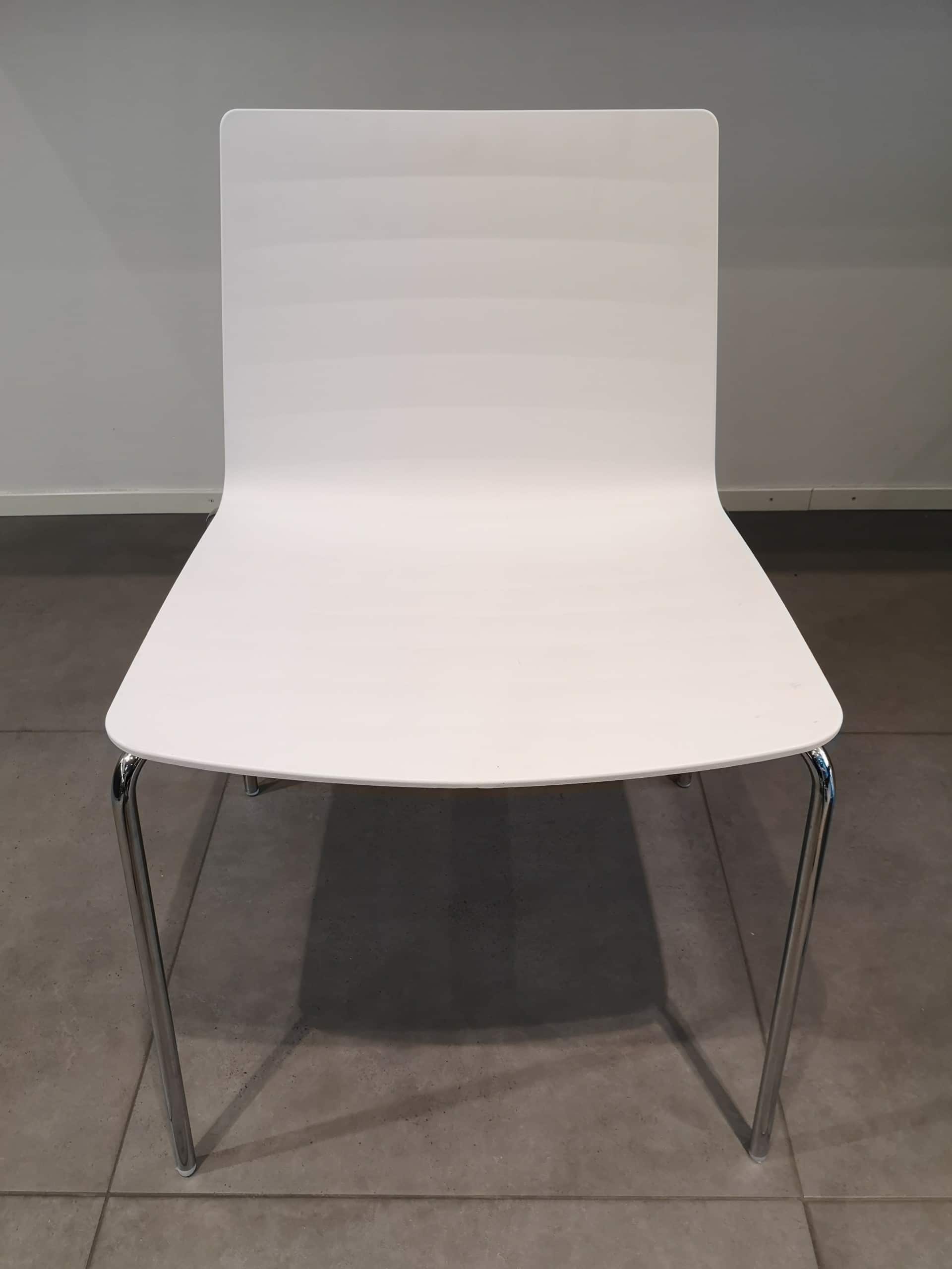 Seat and back in plastic (white). Legs in metal (chrome).