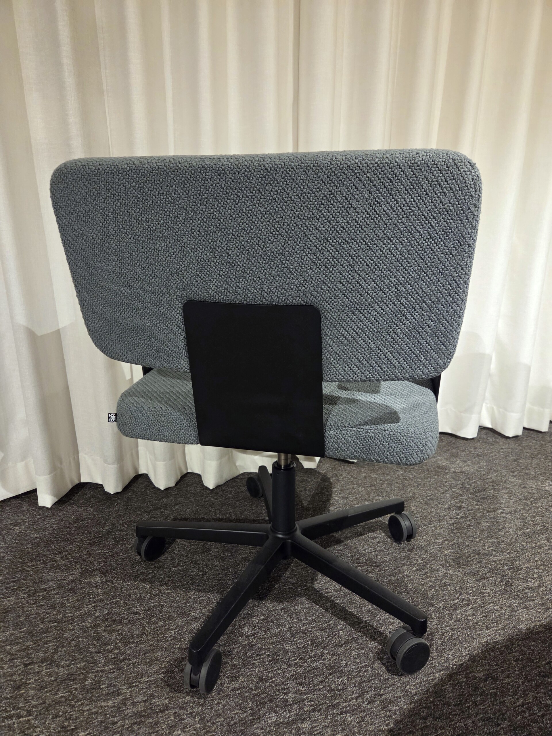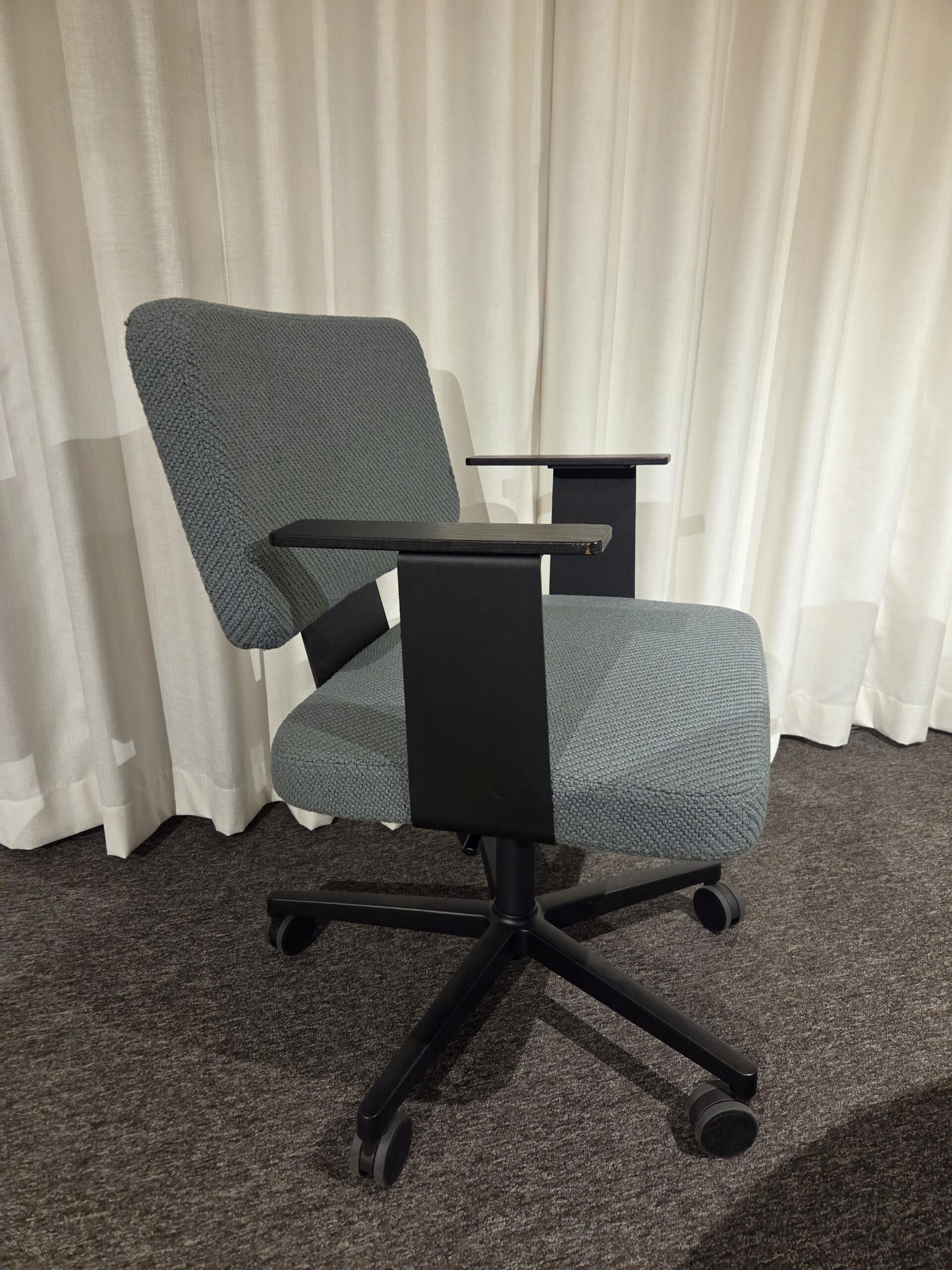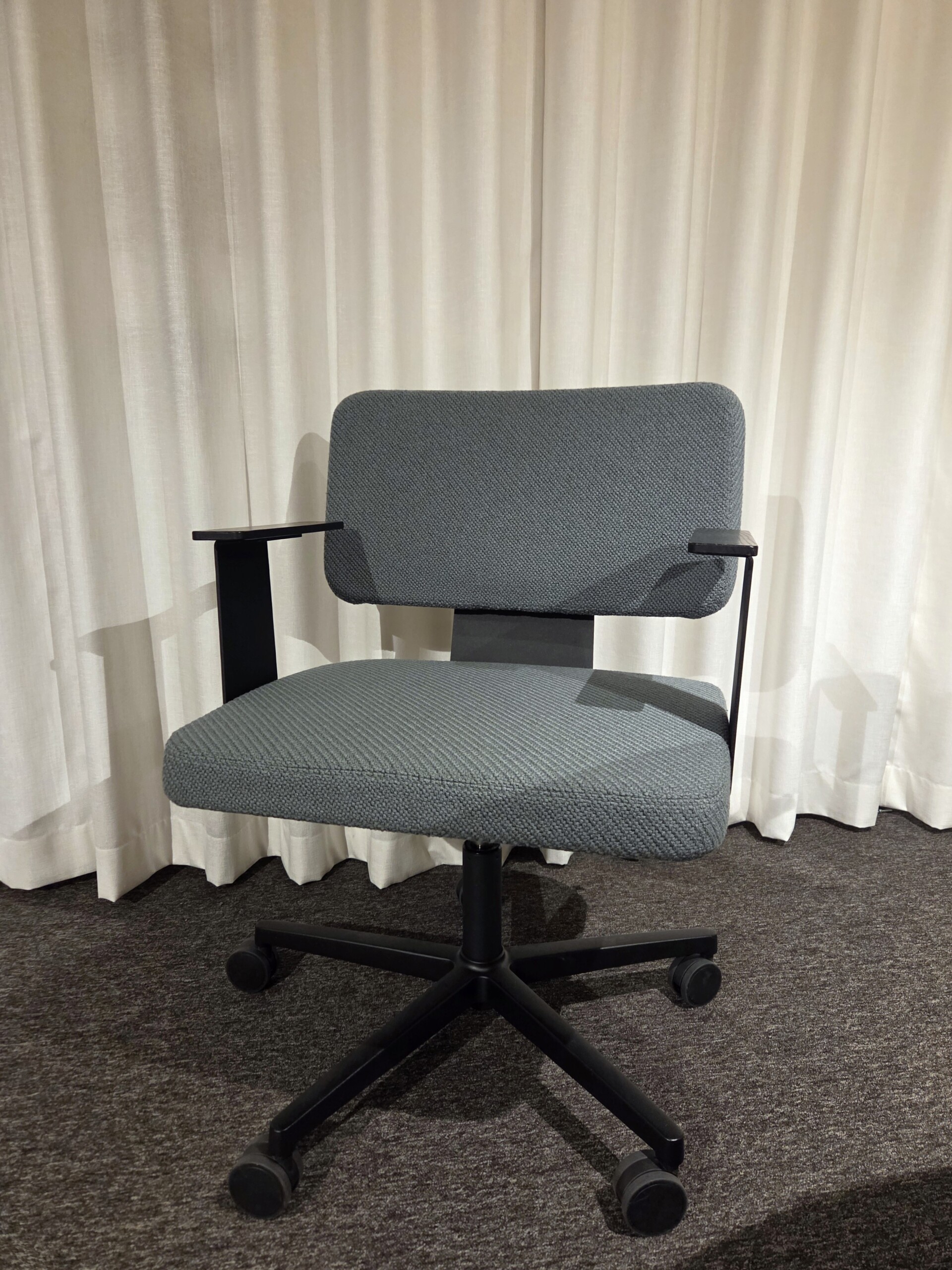 Seat and back in fabric (blue). Cross base in metal (black). Height adjustable.