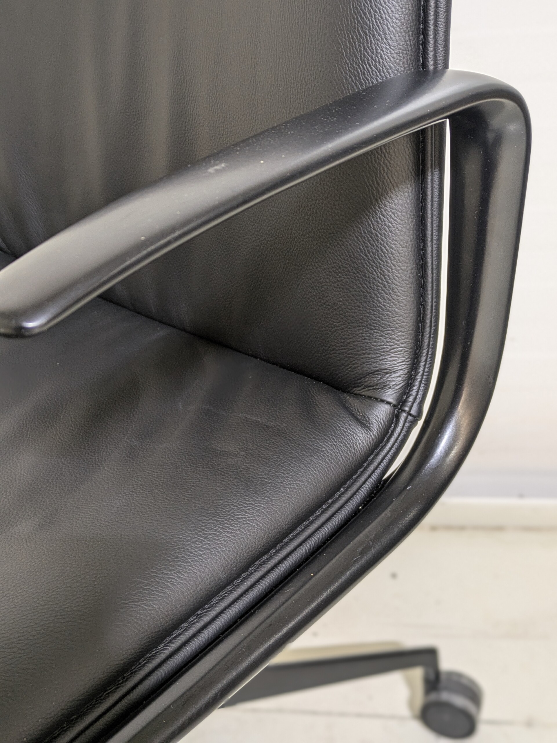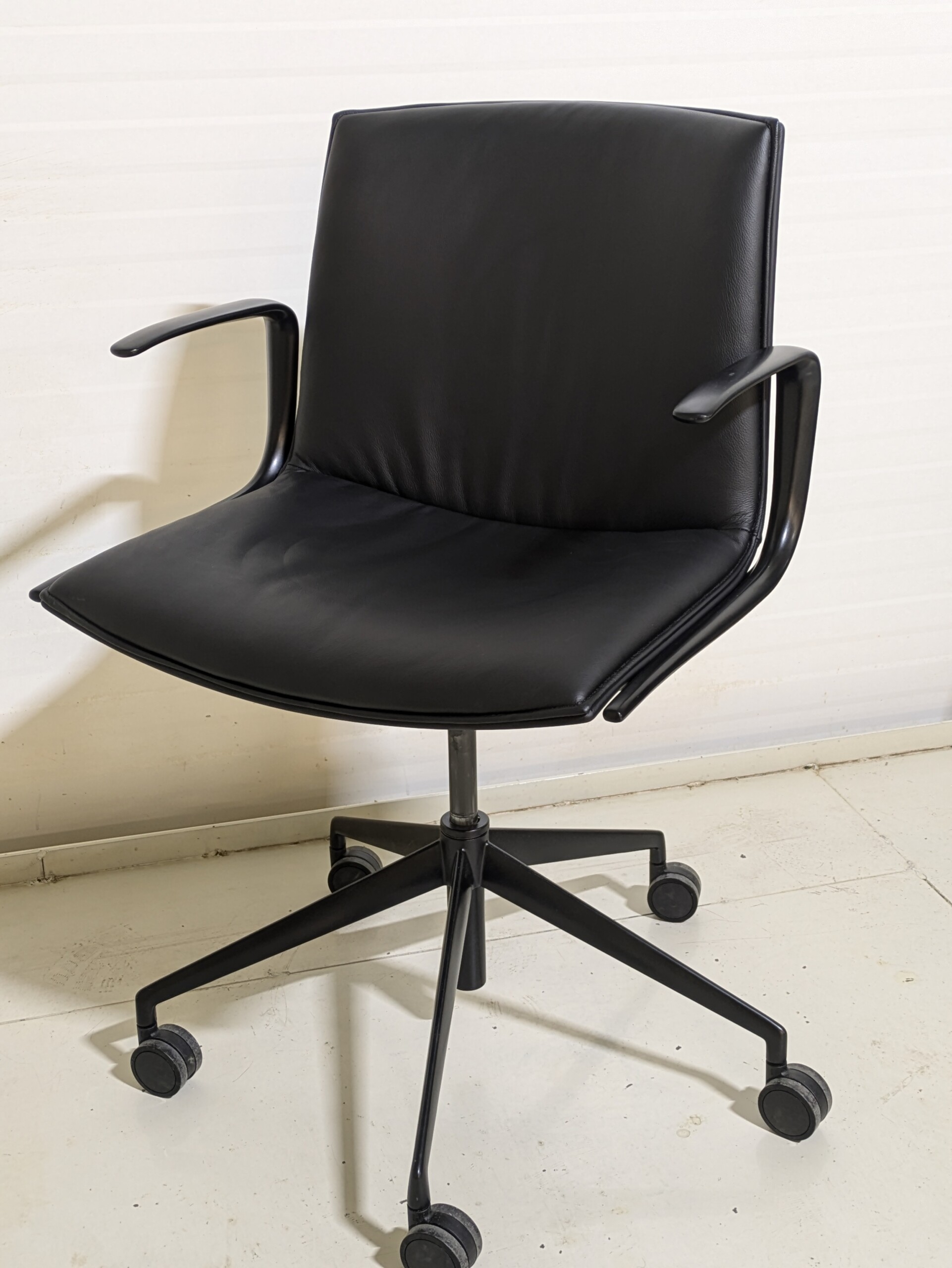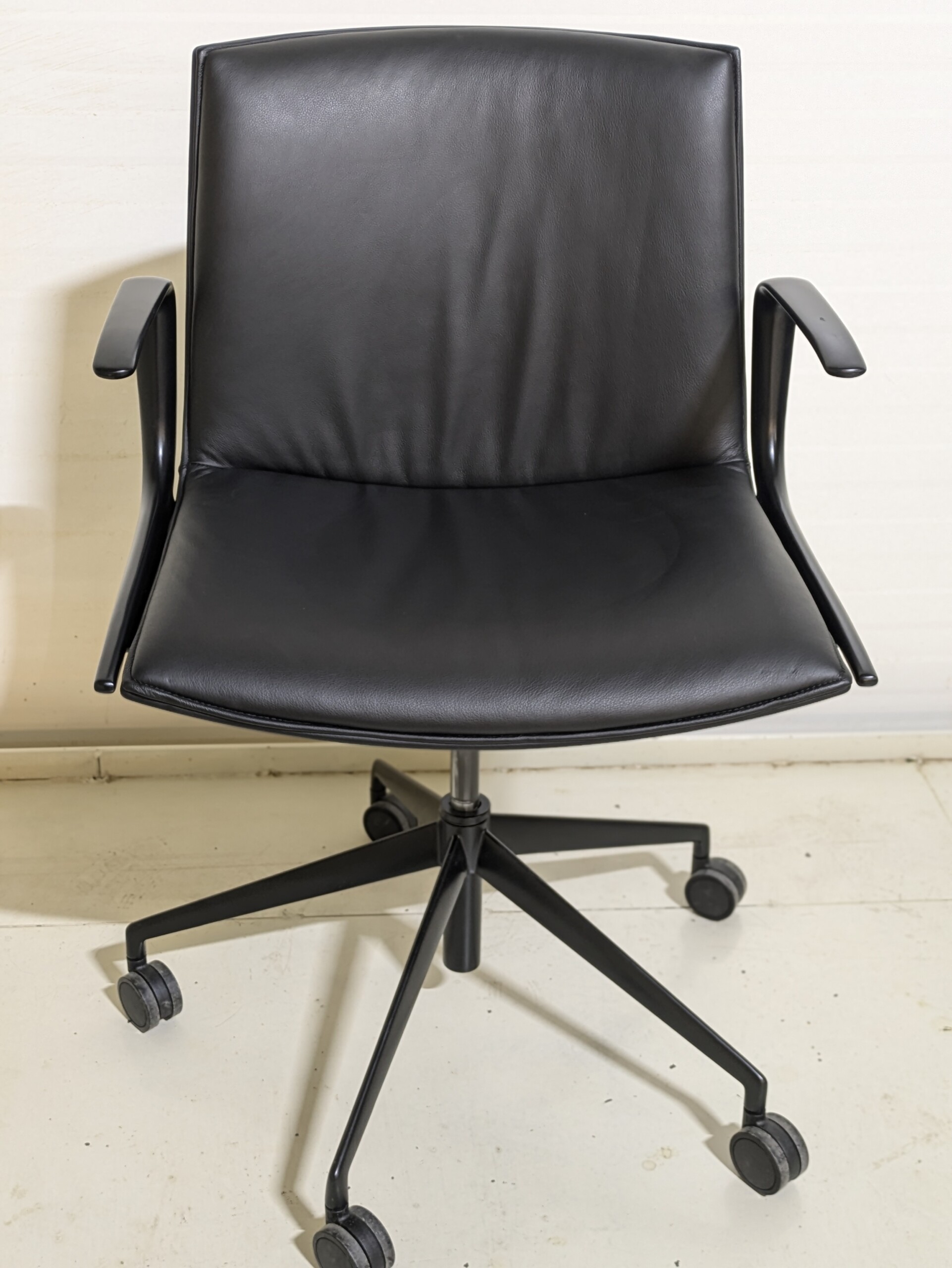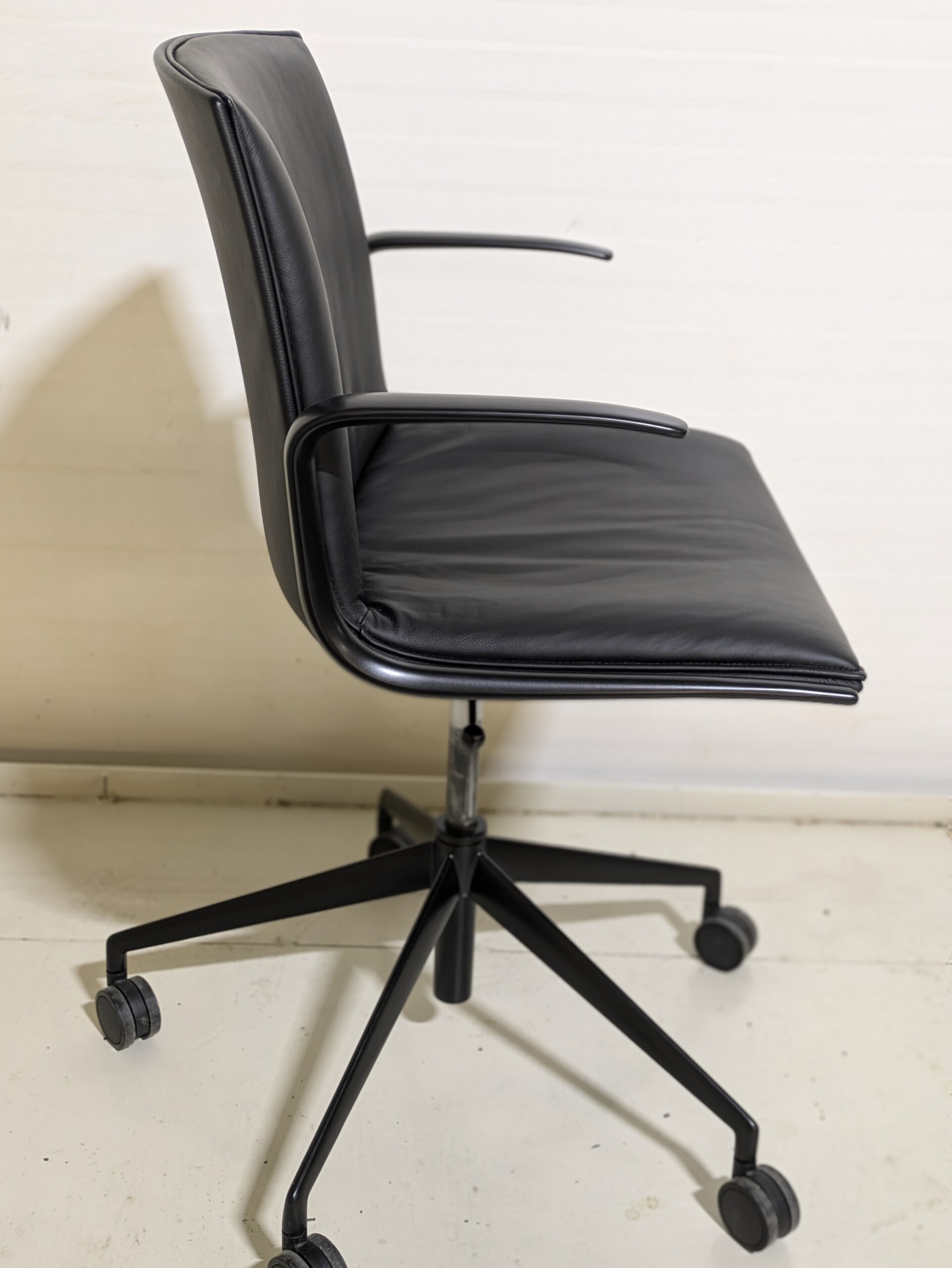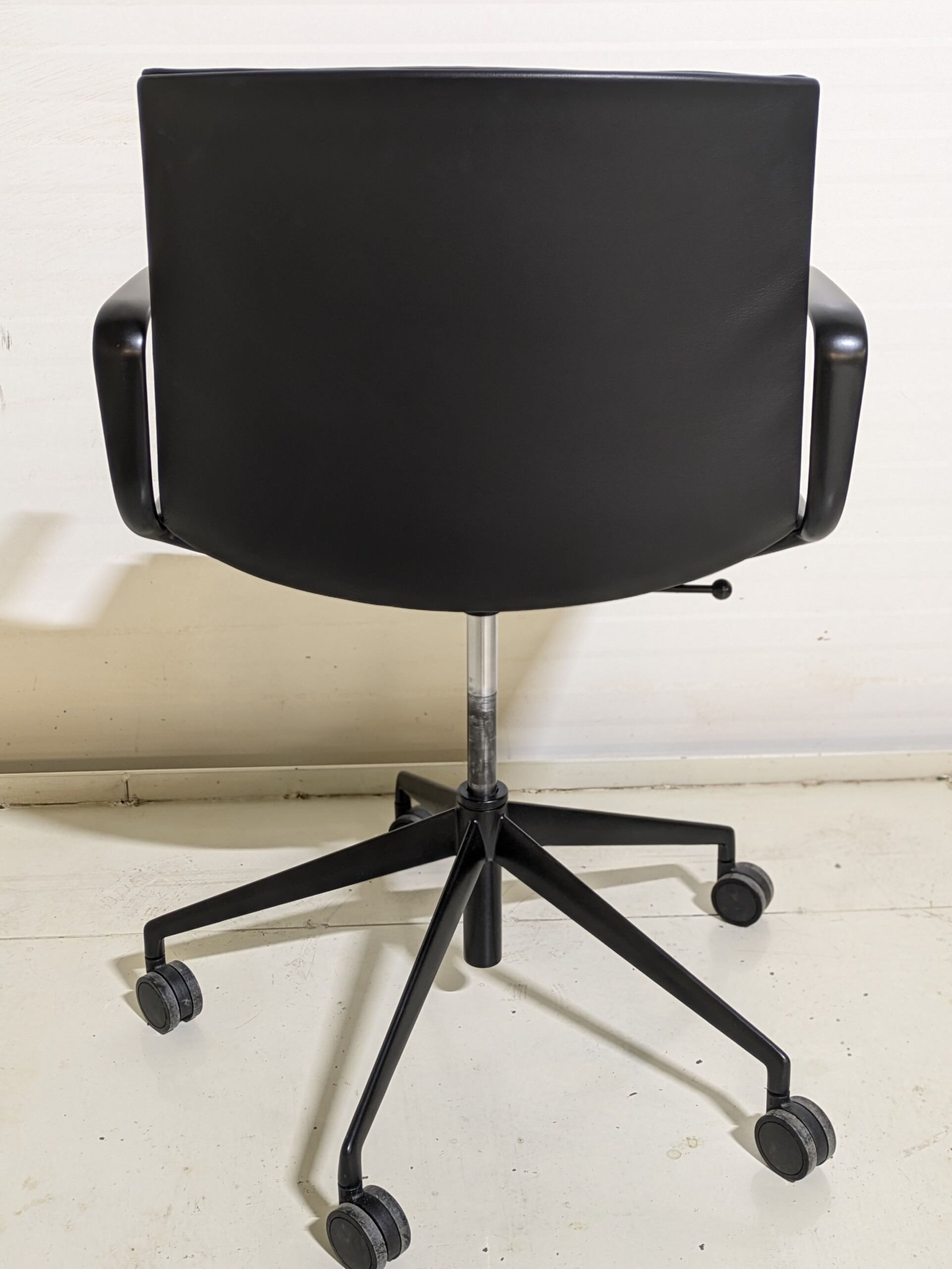Seat and back in faux leather (black). Cross base in metal (black). Height adjustable.