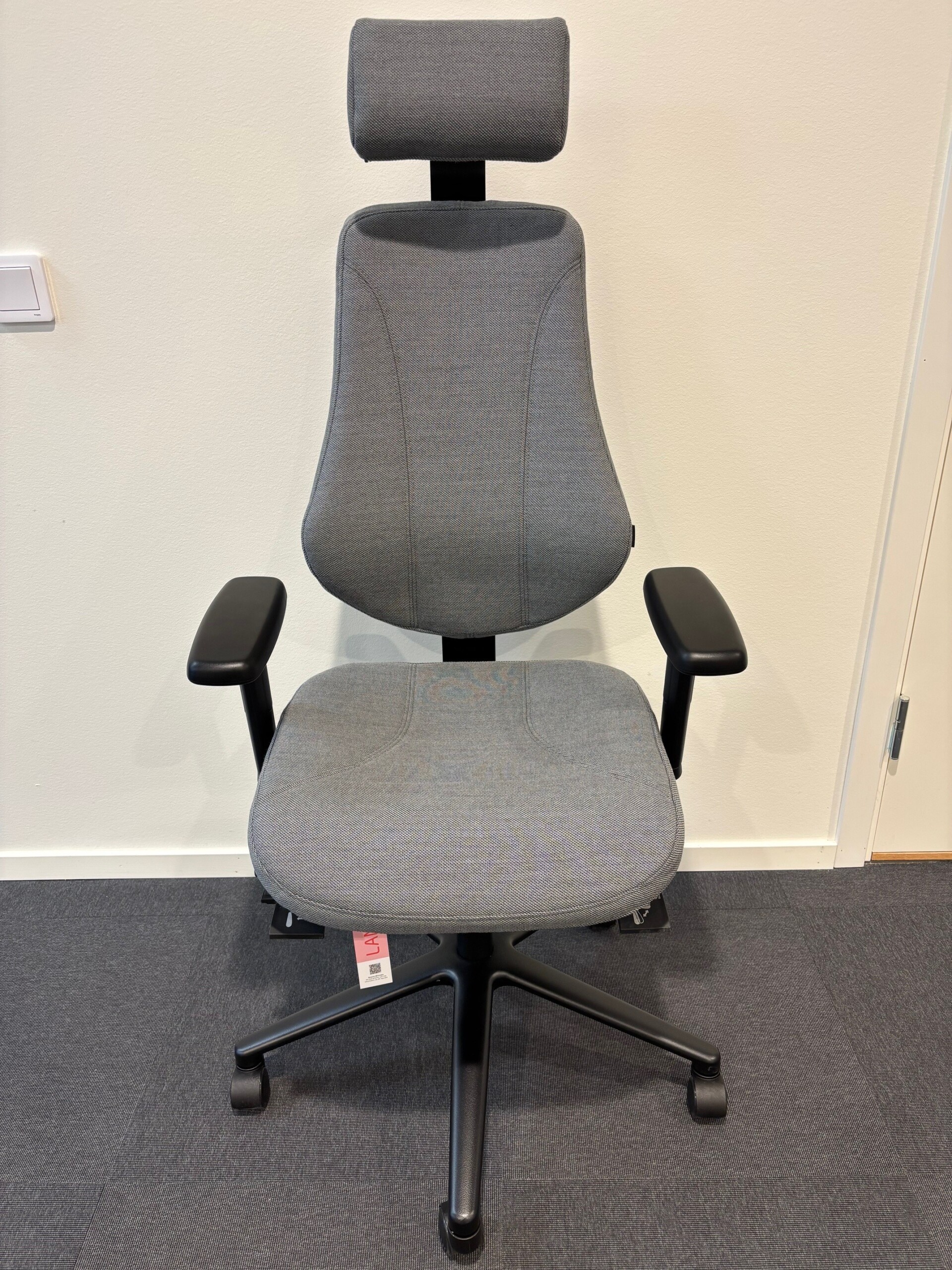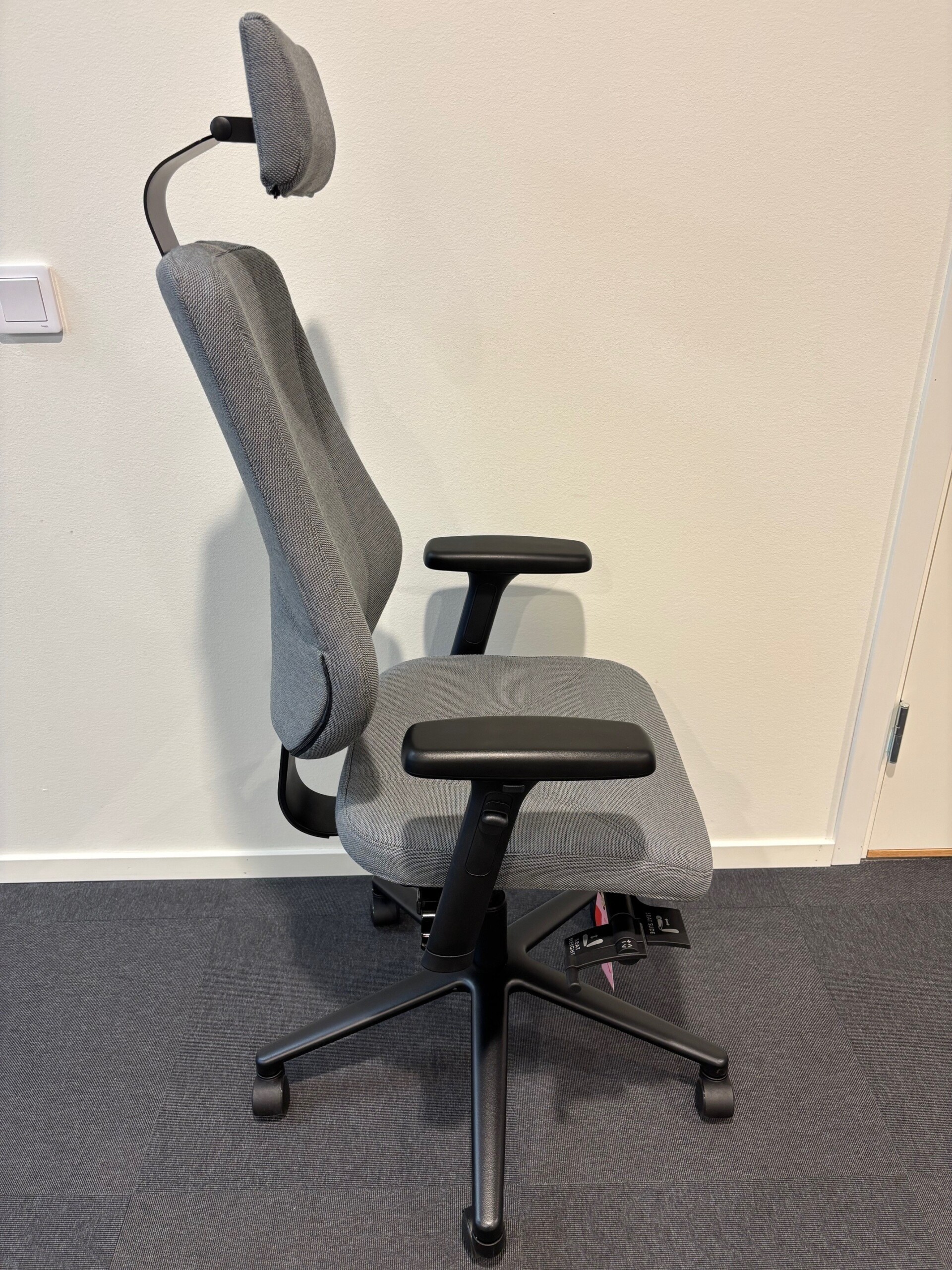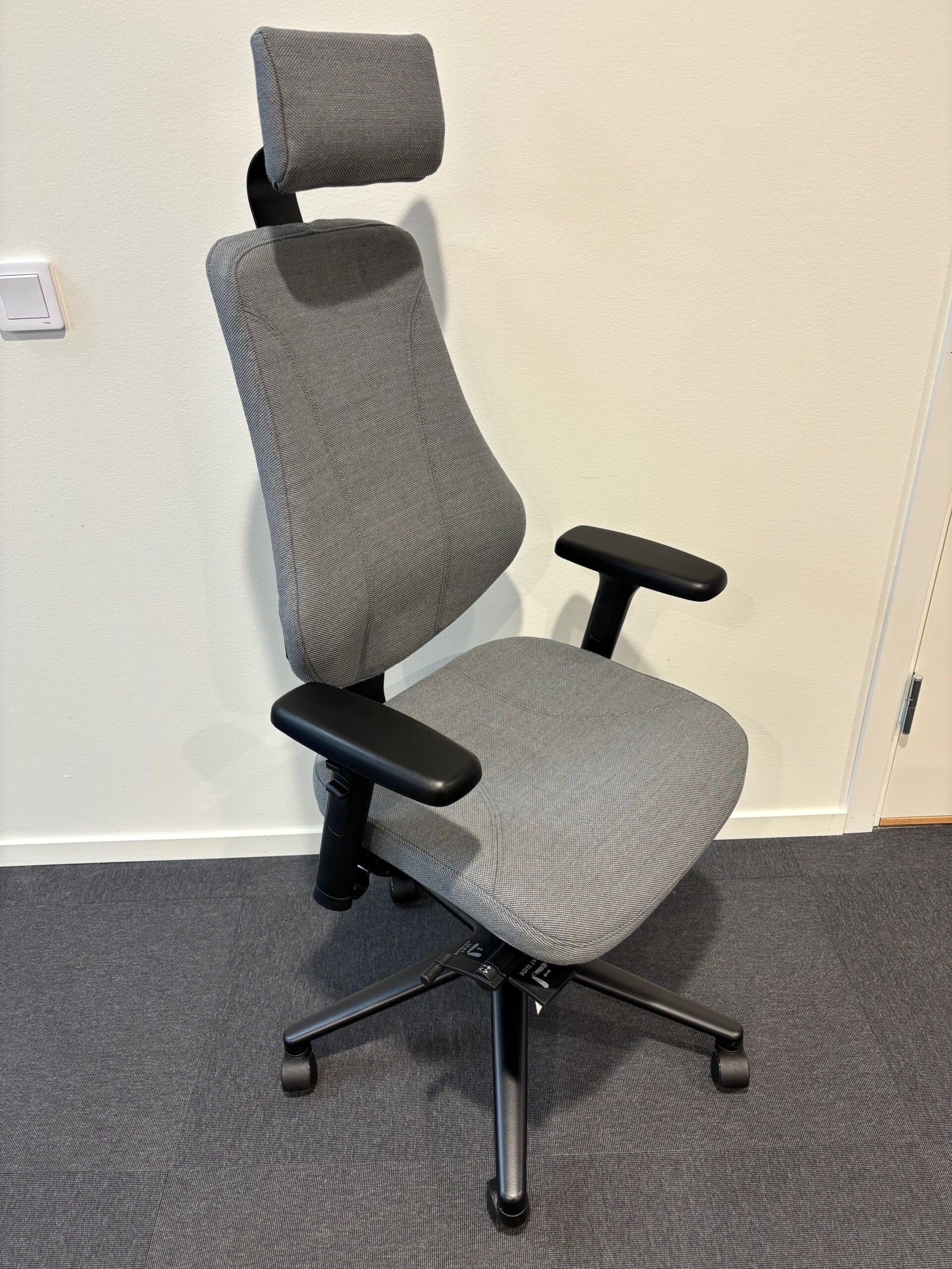 Seat and back in fabric (grey). Cross base in metal (black). Height adjustable.