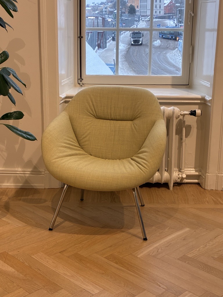 Seat and back in fabric (yellow). Legs in metal (chrome).