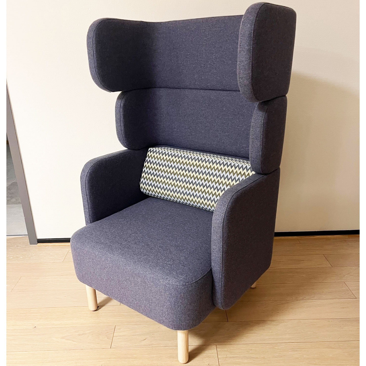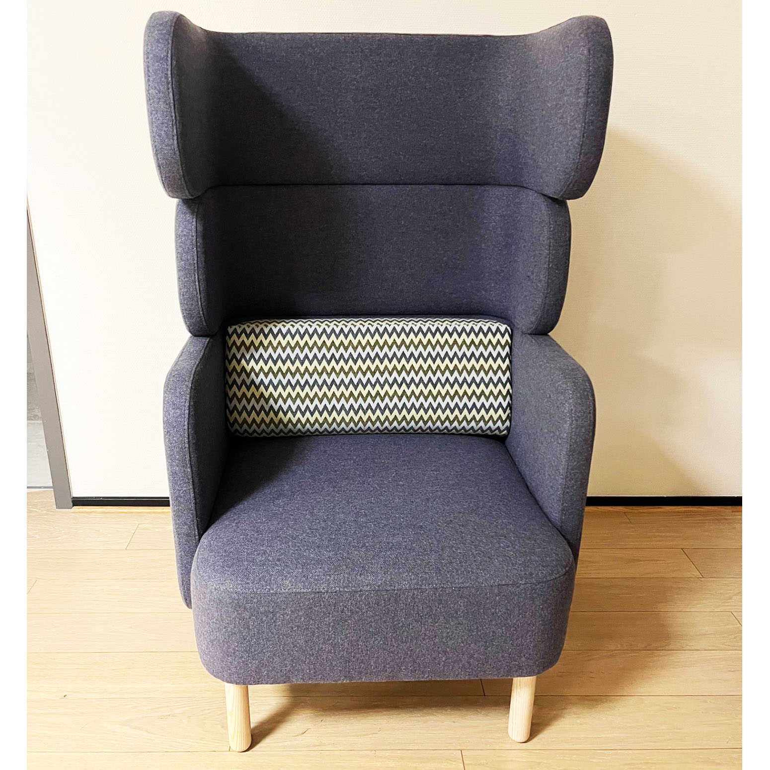 Seat and back in fabric (blue). Legs in wood (ash).