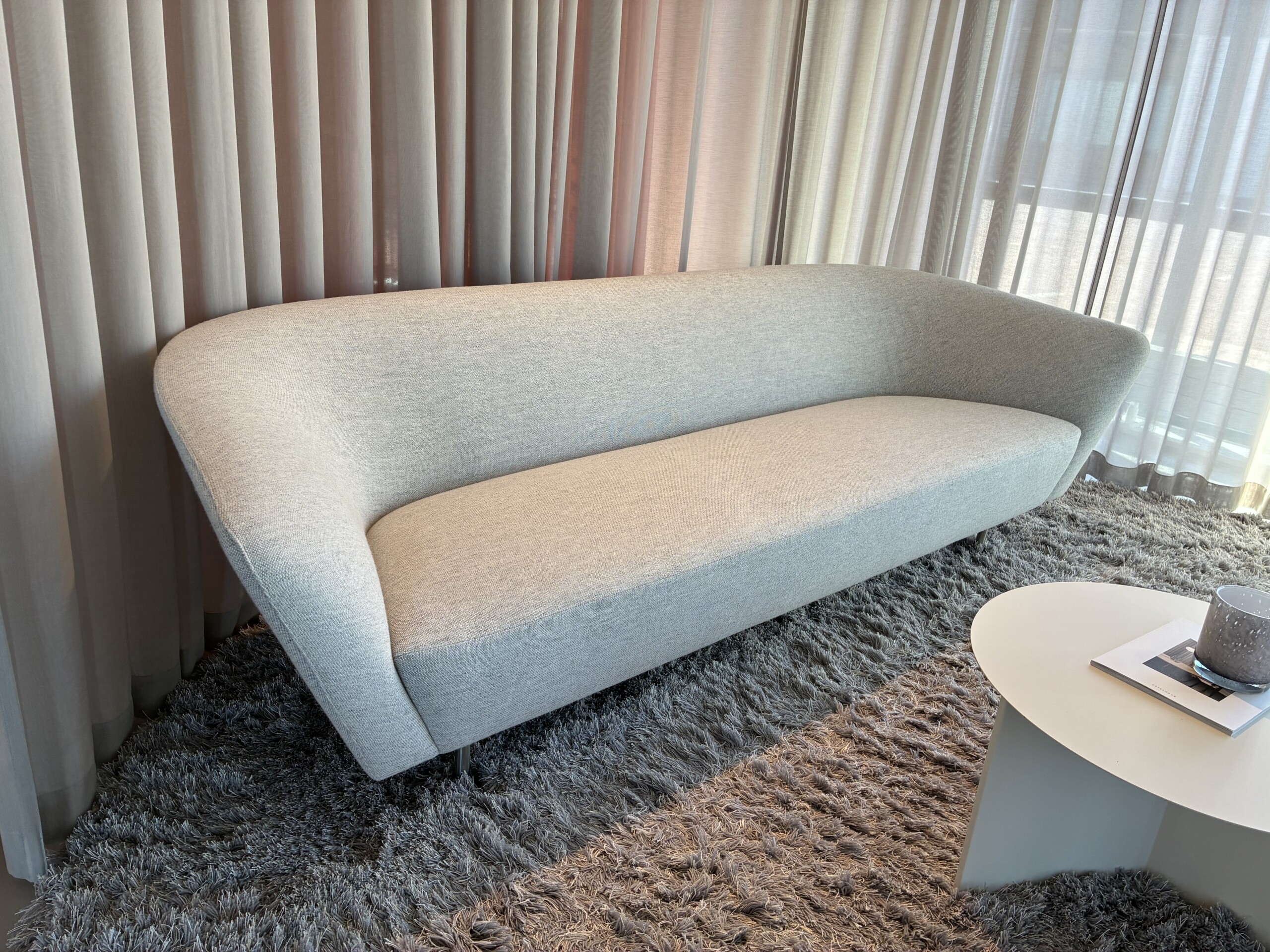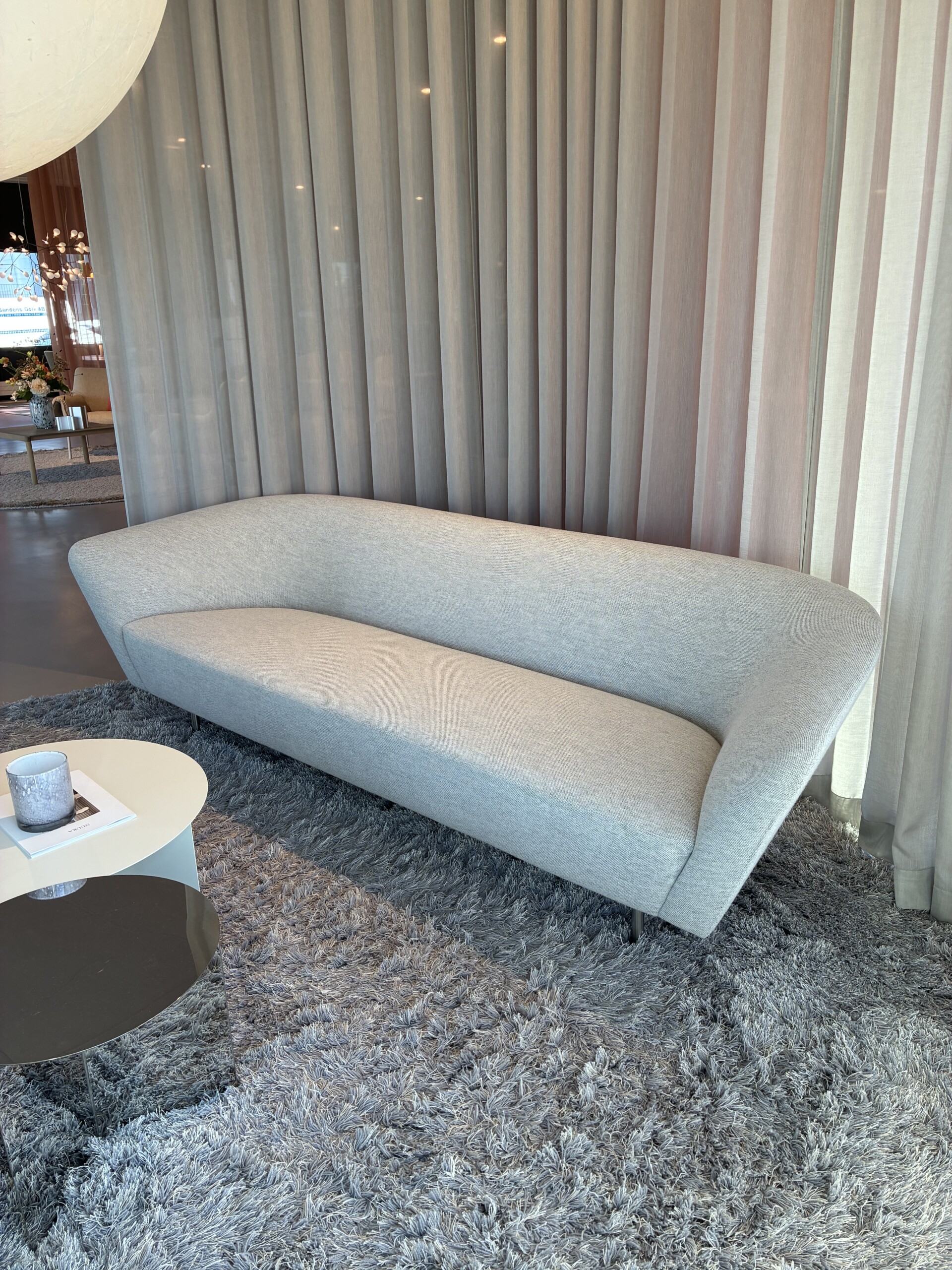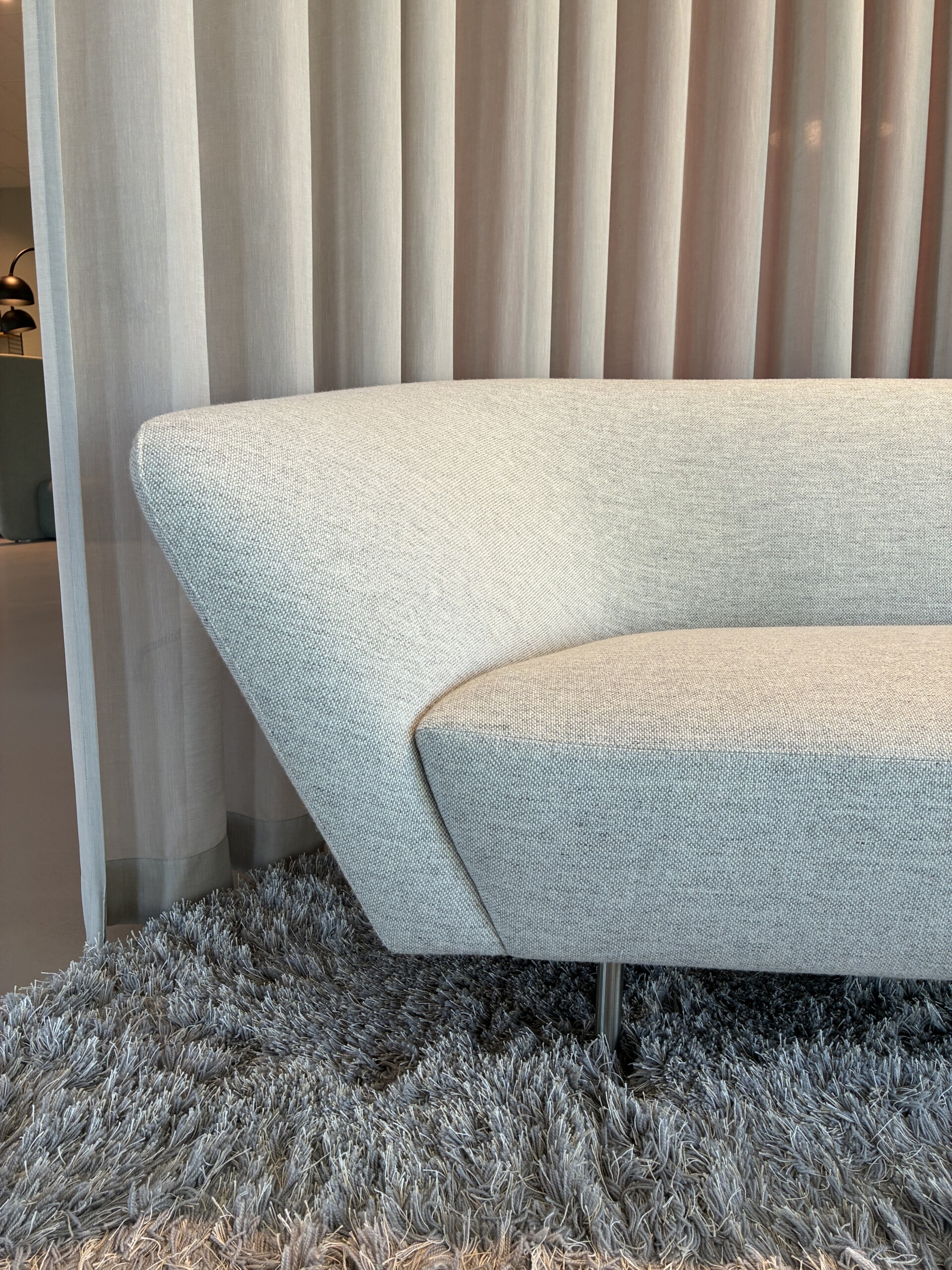 Seat and back in fabric (grey). Legs in metal (chrome).