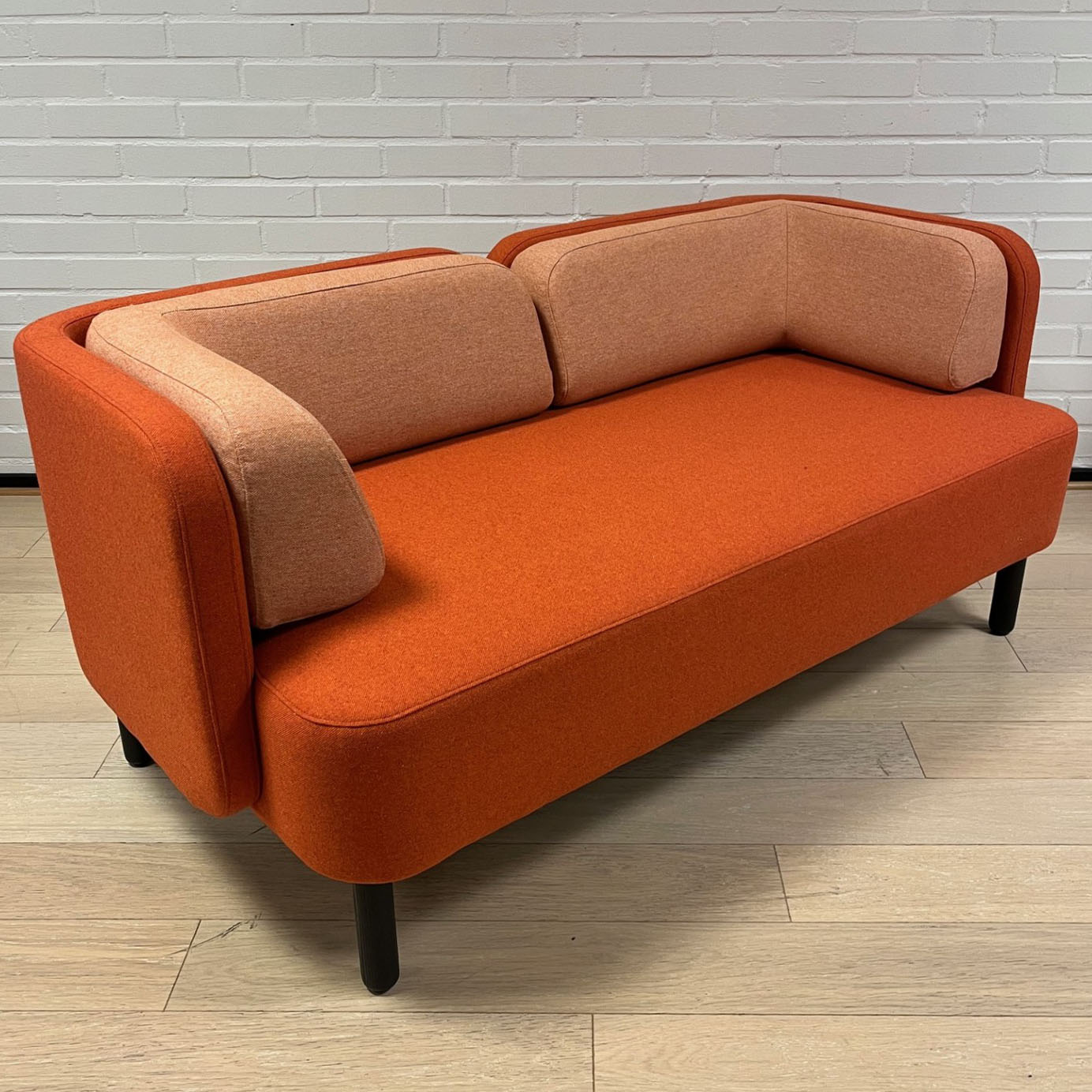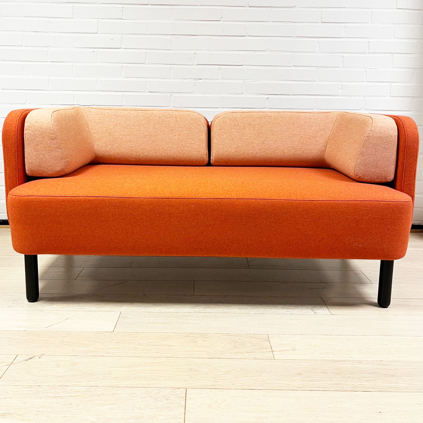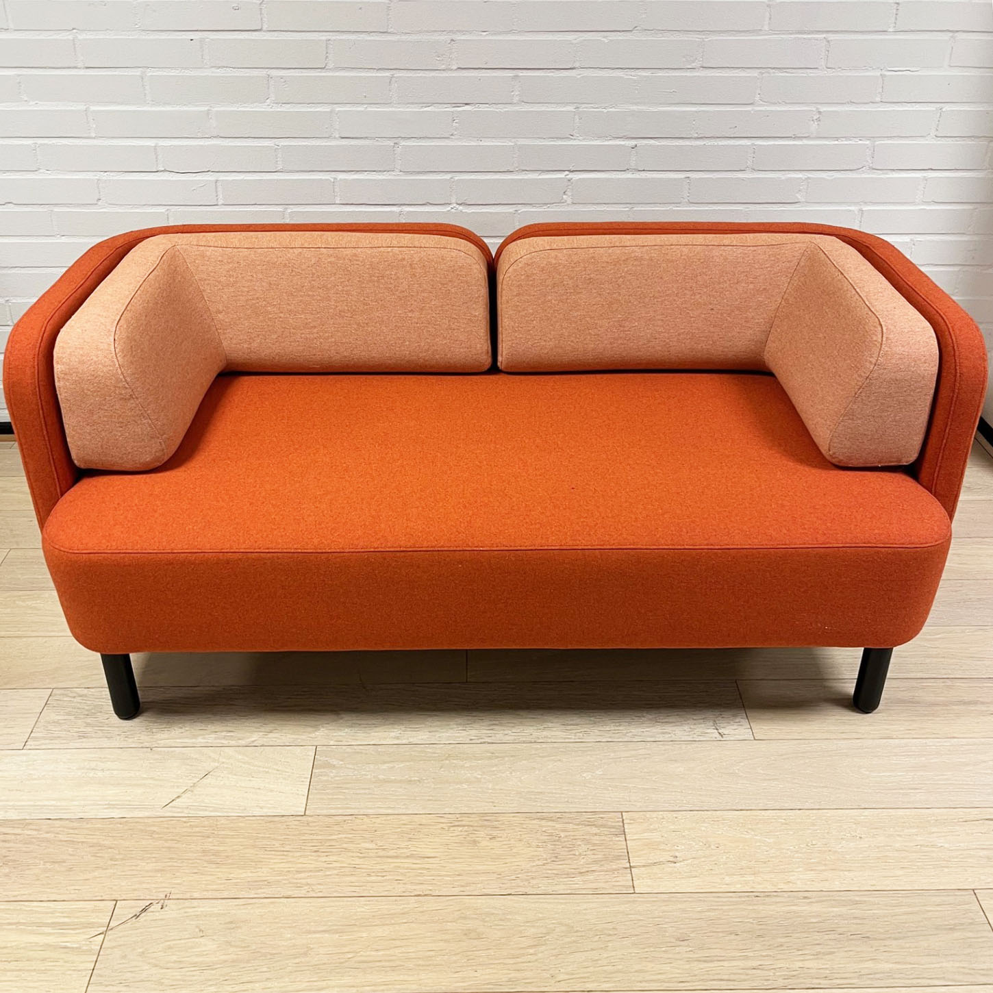 Seat and back in fabric (orange). Legs in wood (black).