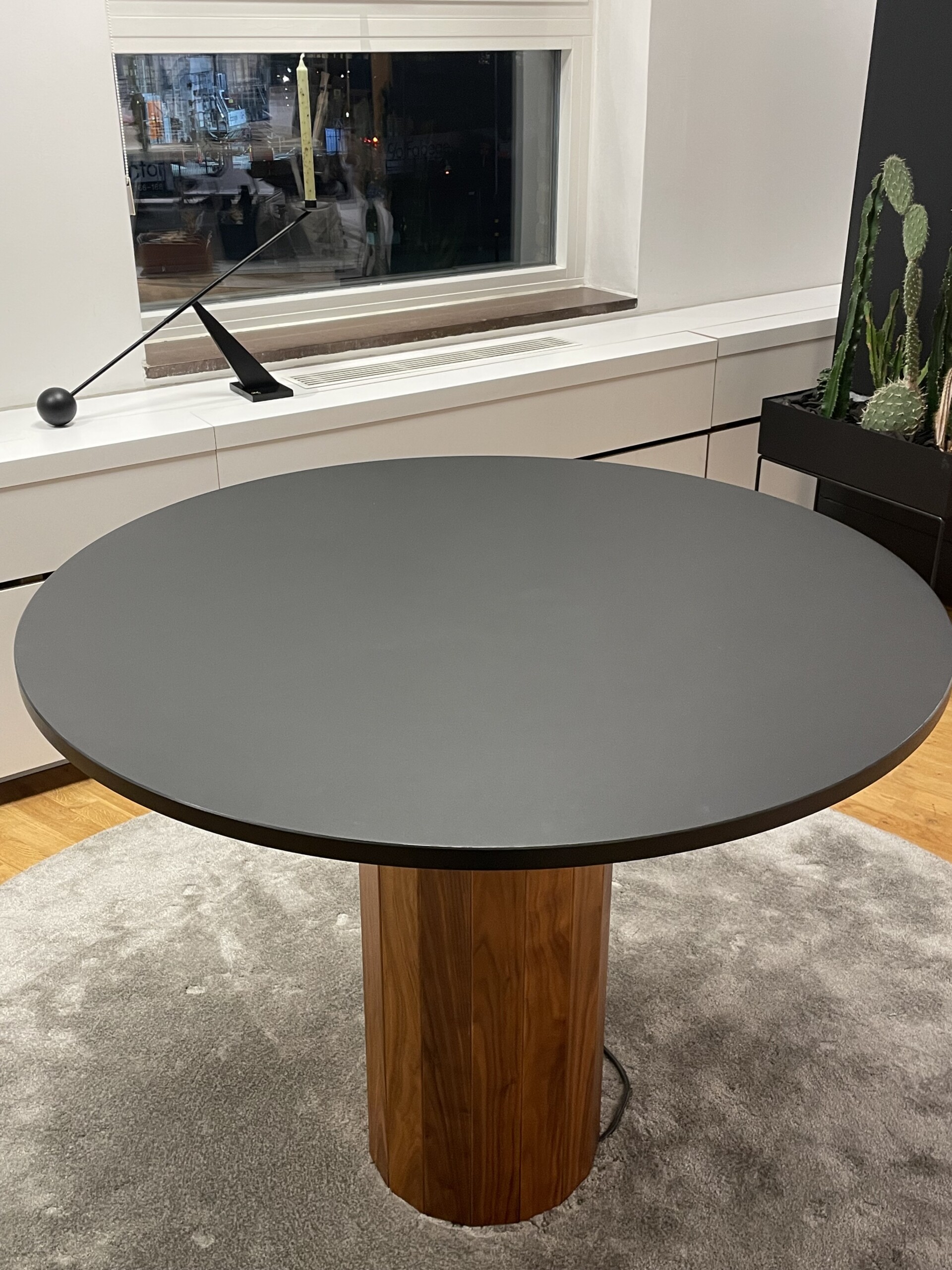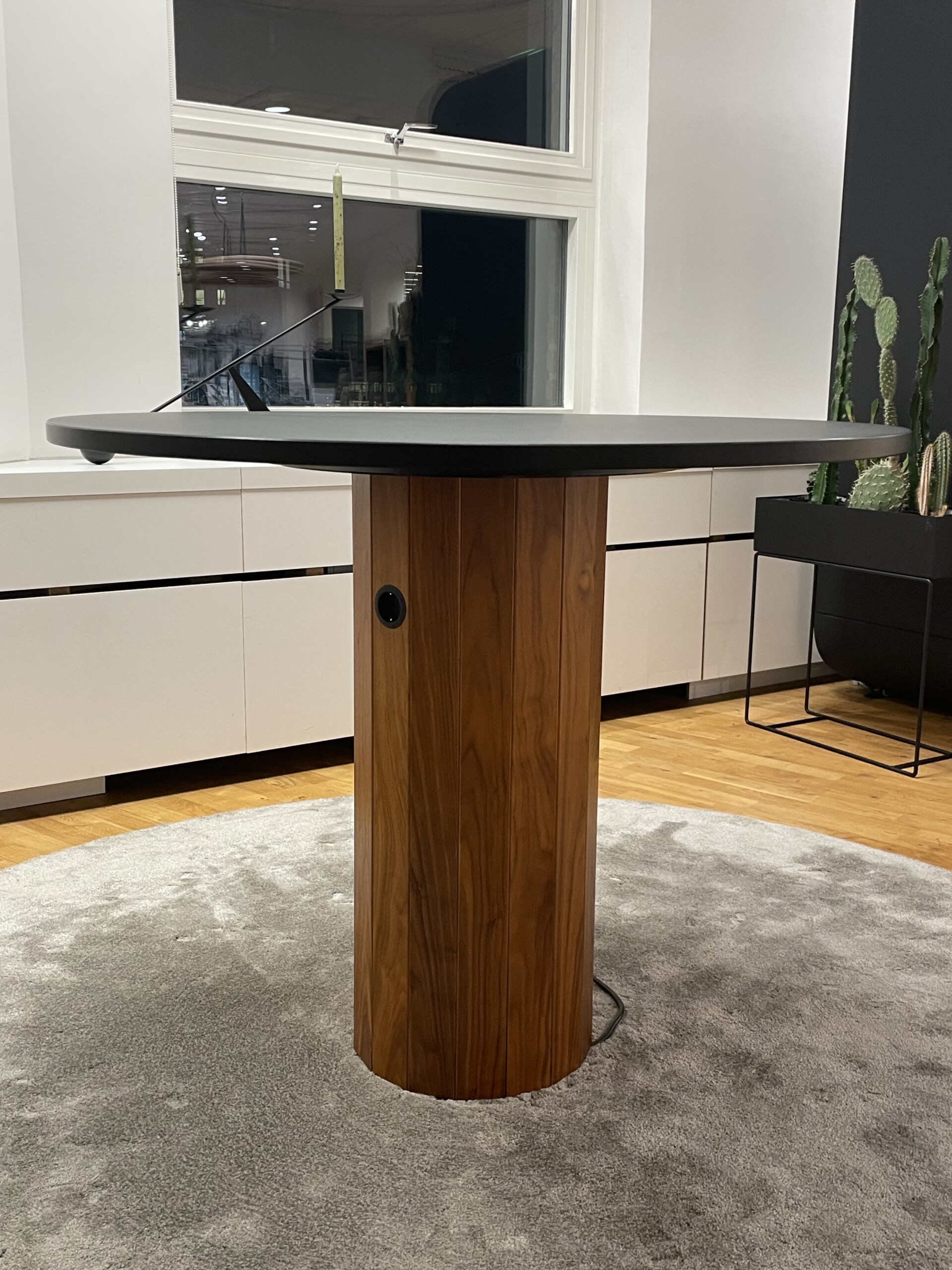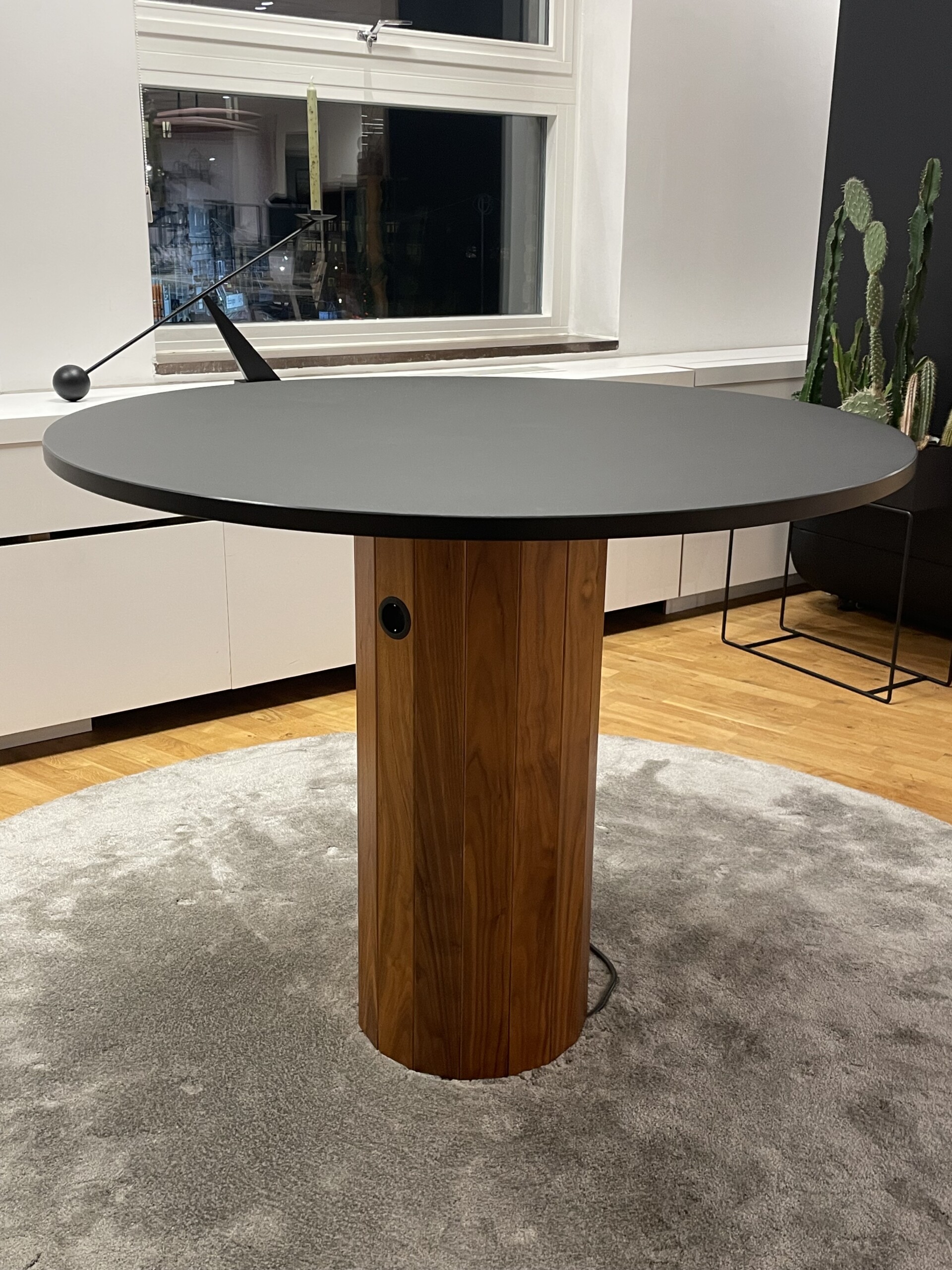 Tabletop in linoleum (black). Base in wood (walnut).