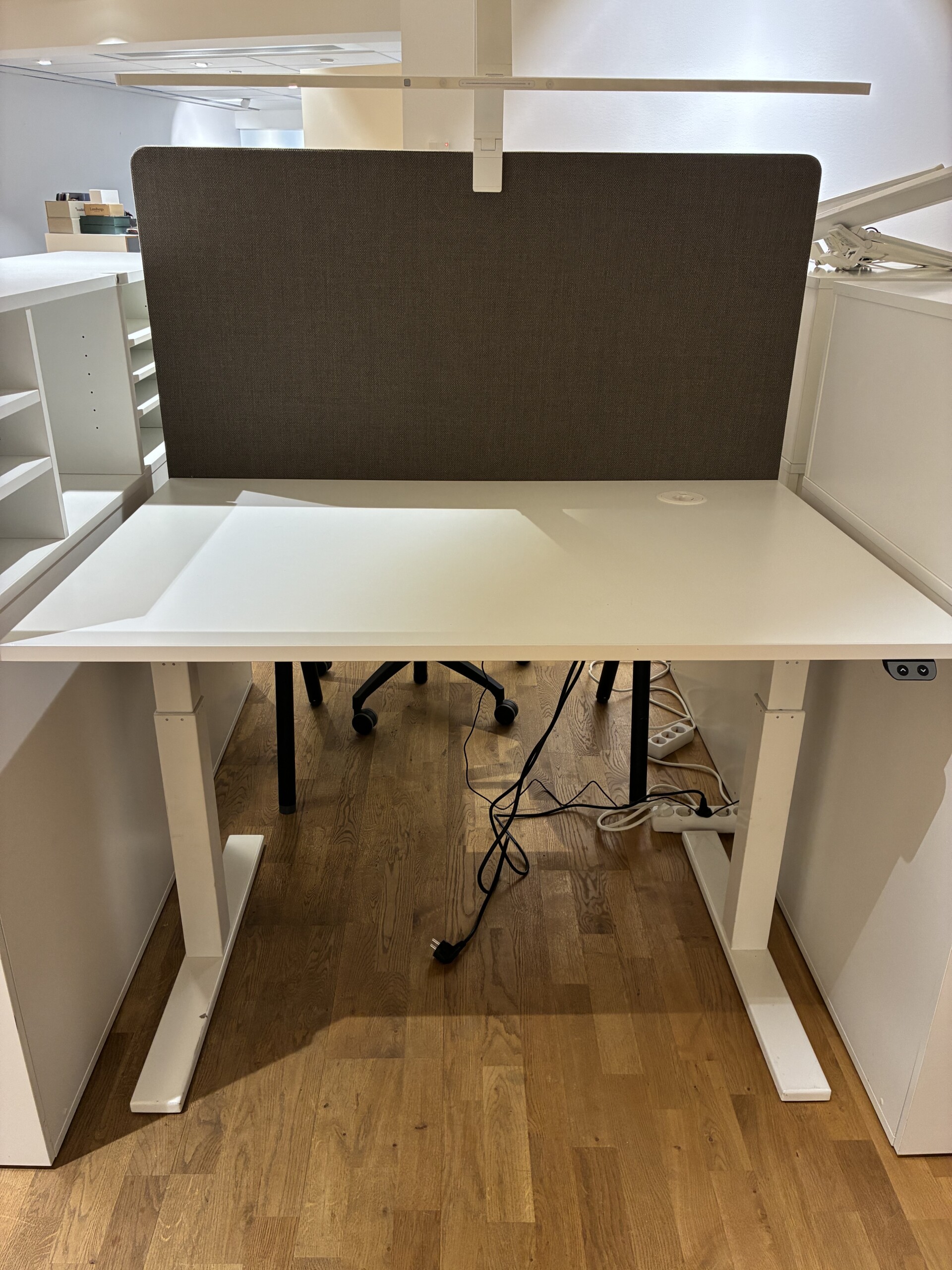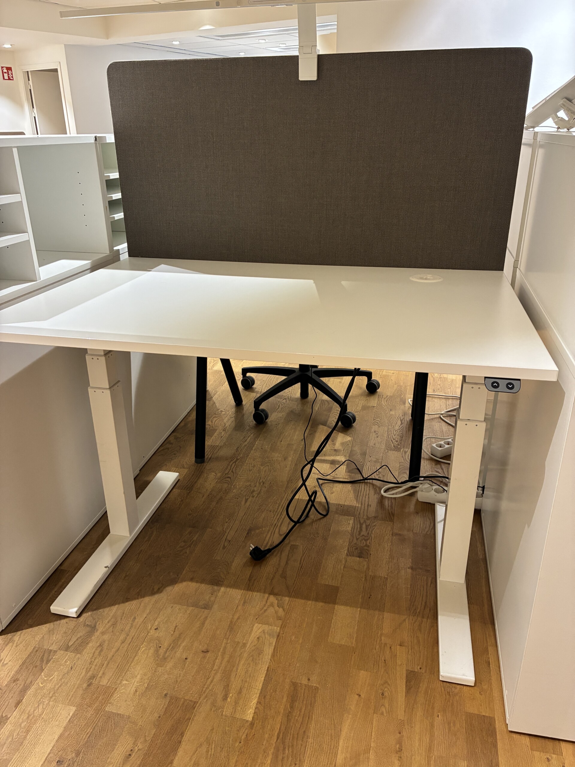 Bordsskärm, kabelränna, uttag.