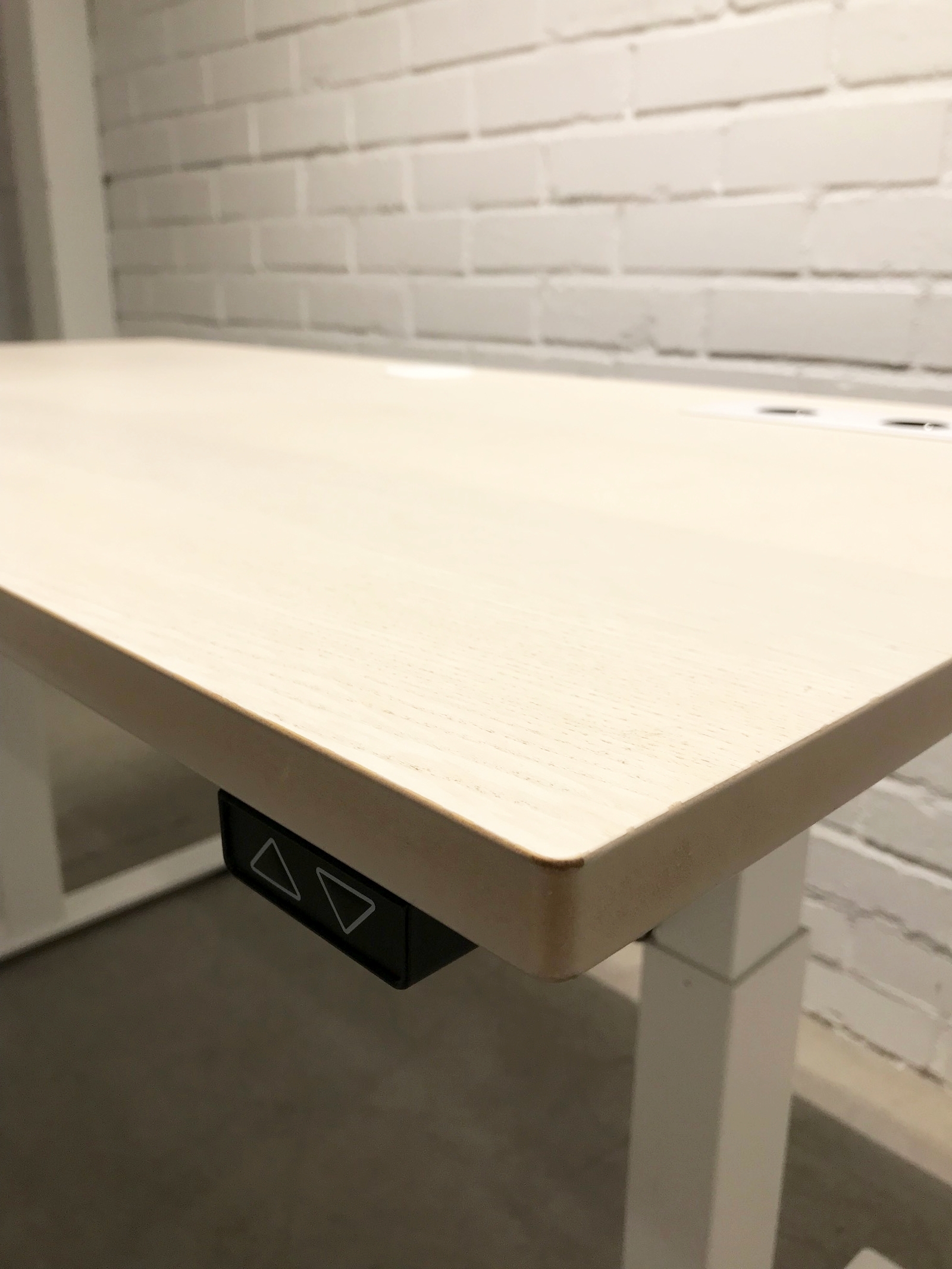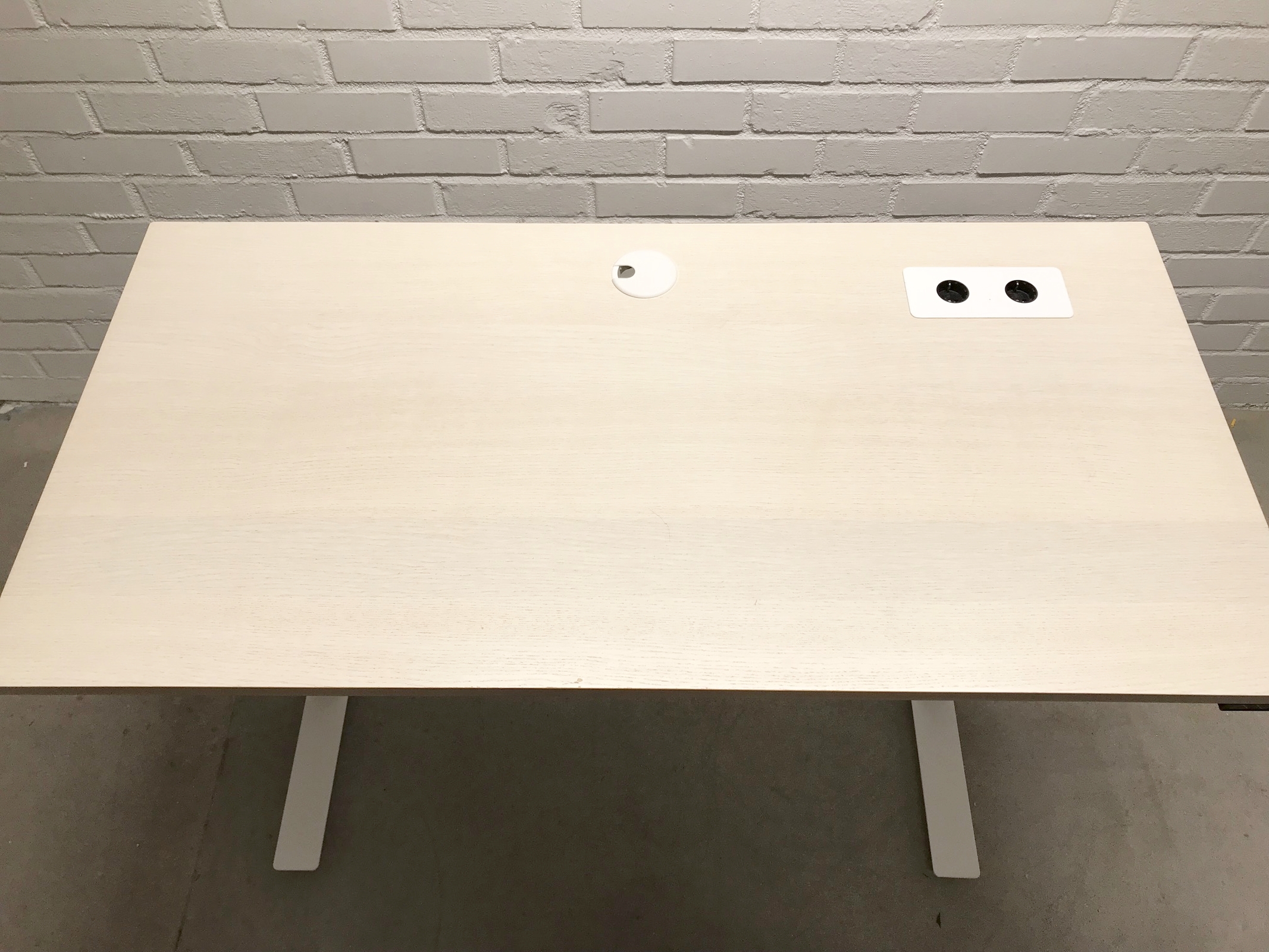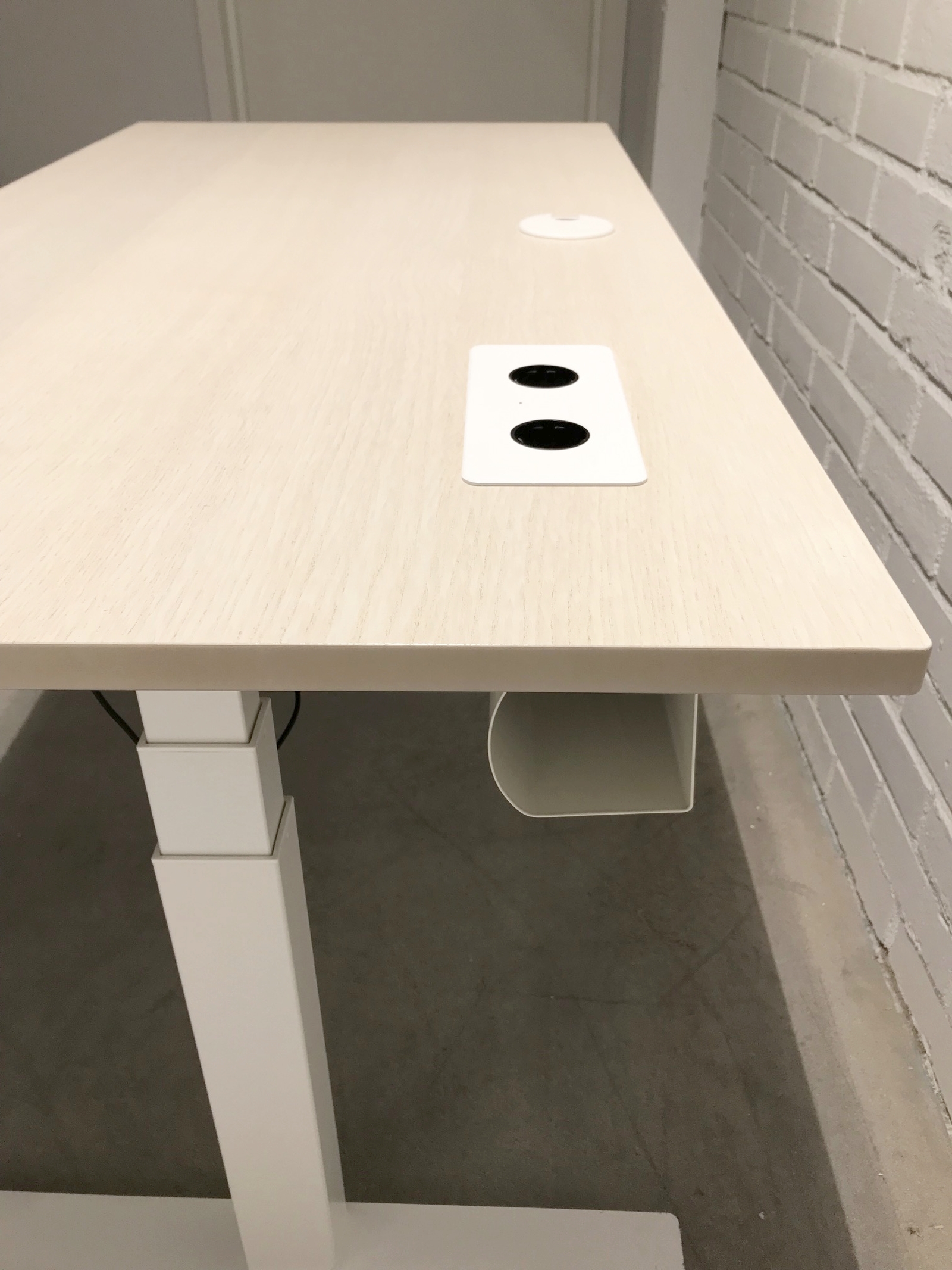 Tabletop in laminate (ash). Base in metal (white). Height adjustable.