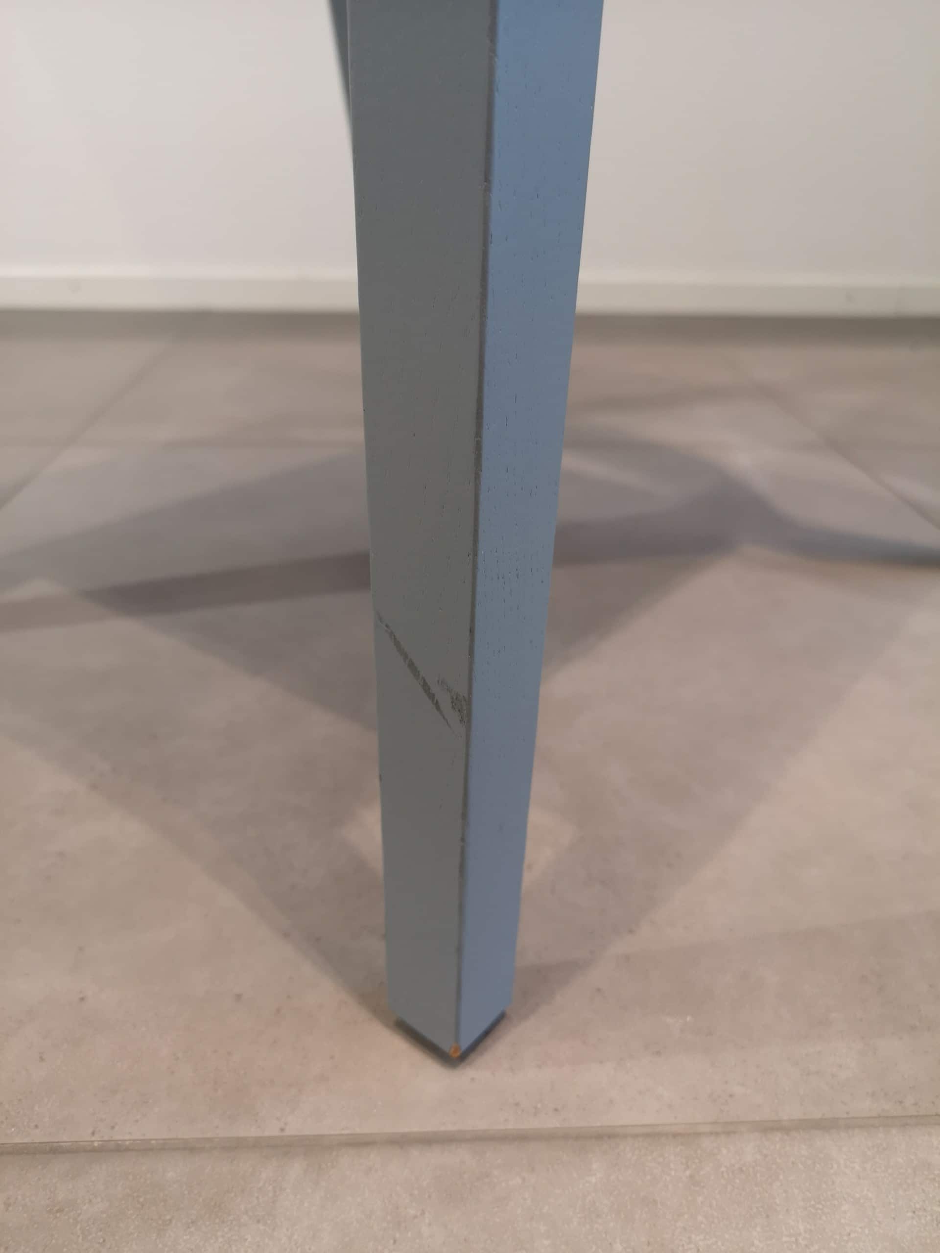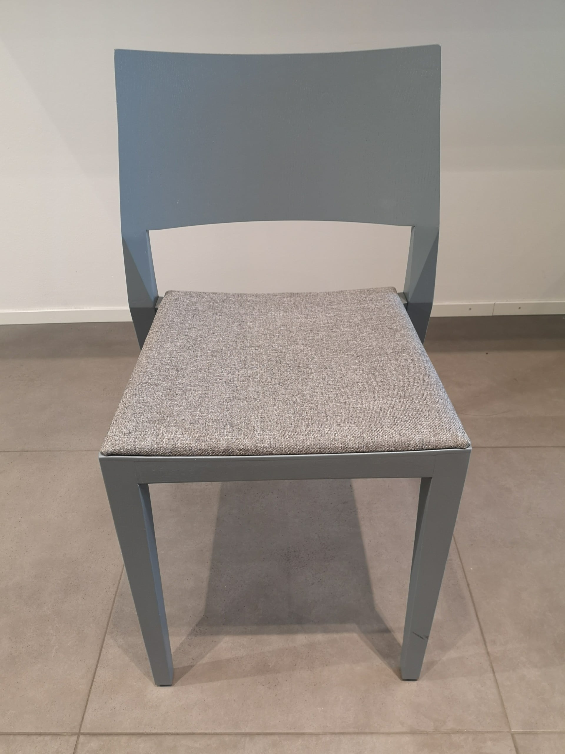 Seat in fabric (grey). Back in wood (blue). Legs in wood (blue).