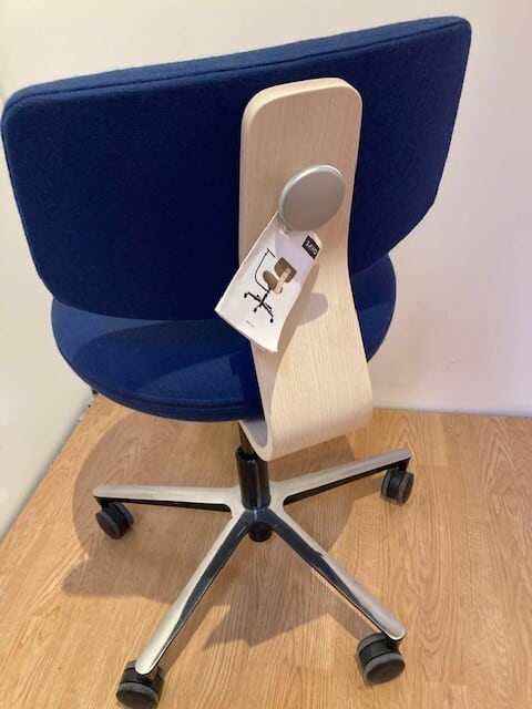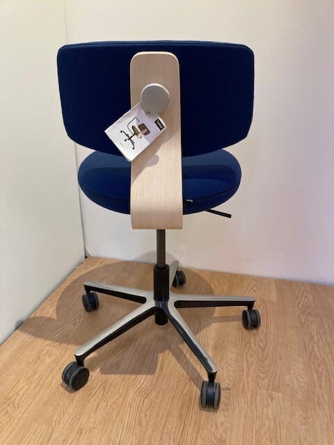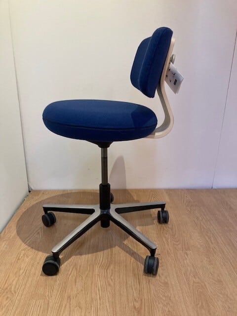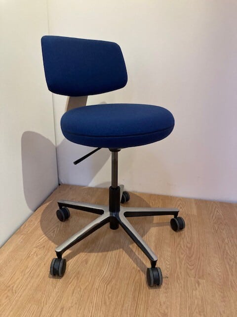 Seat and back in fabric (blue). Cross base in metal (aluminum). Height adjustable.