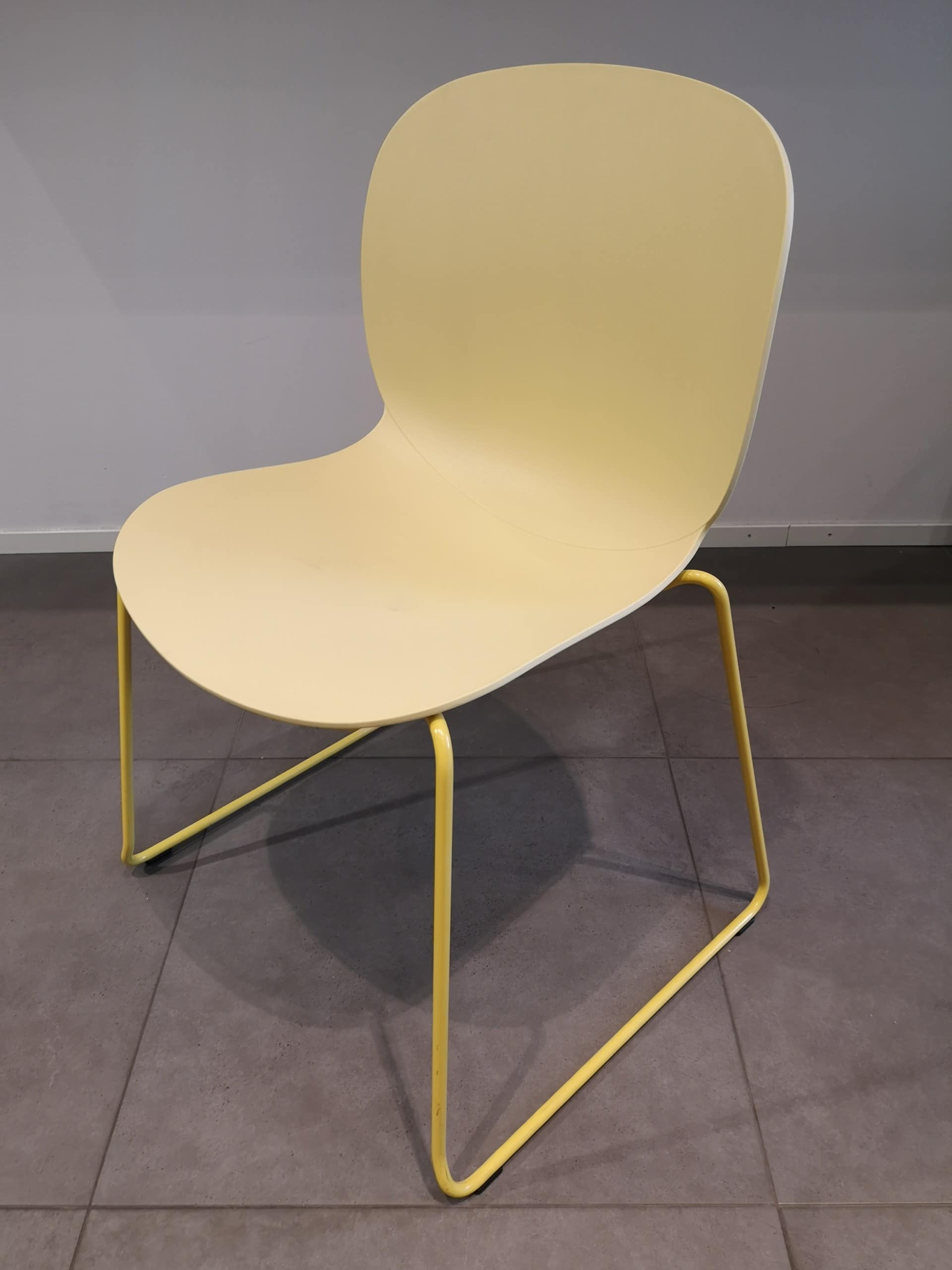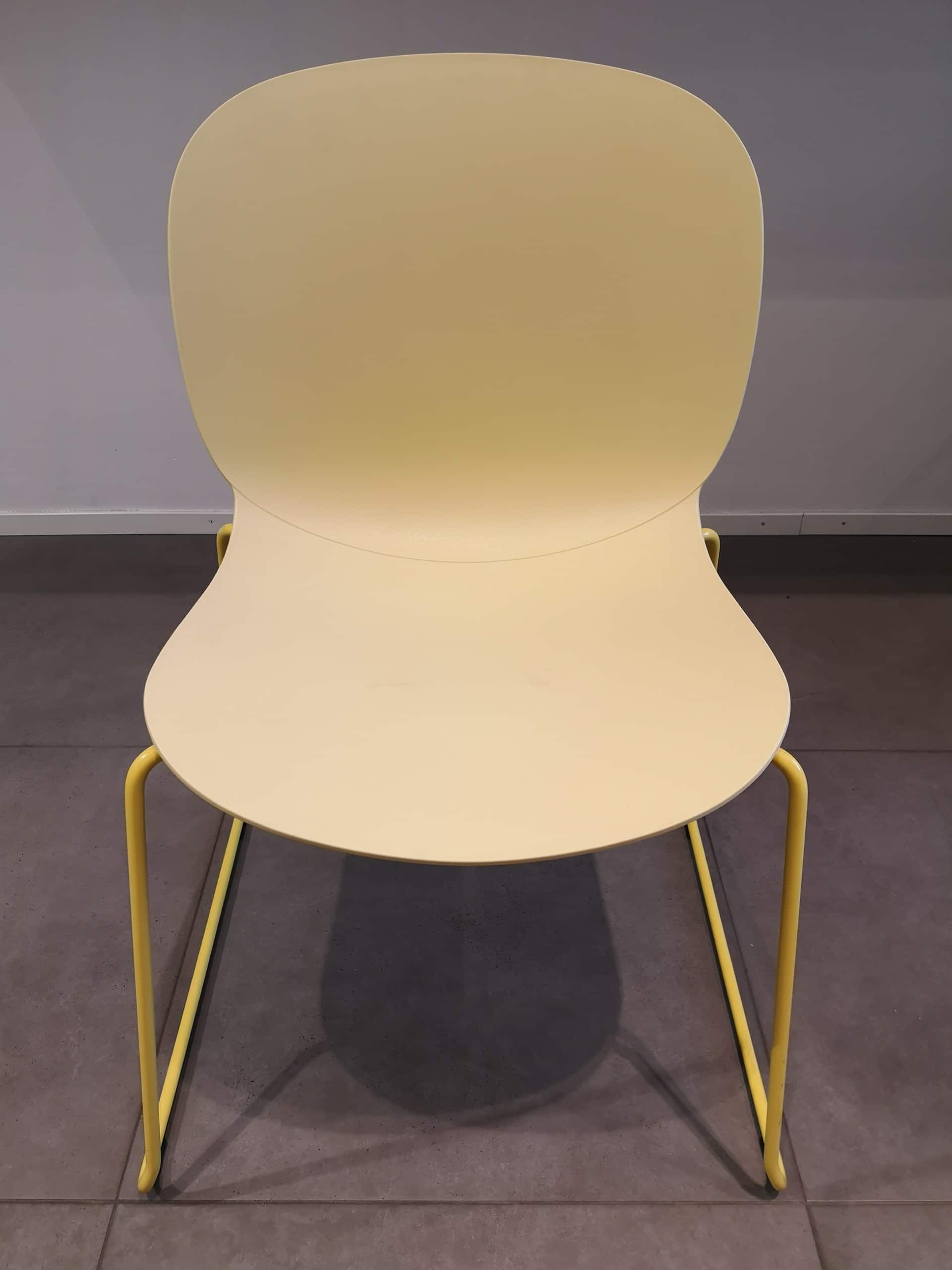 Seat and back in plastic (yellow). With stand in metal (yellow).