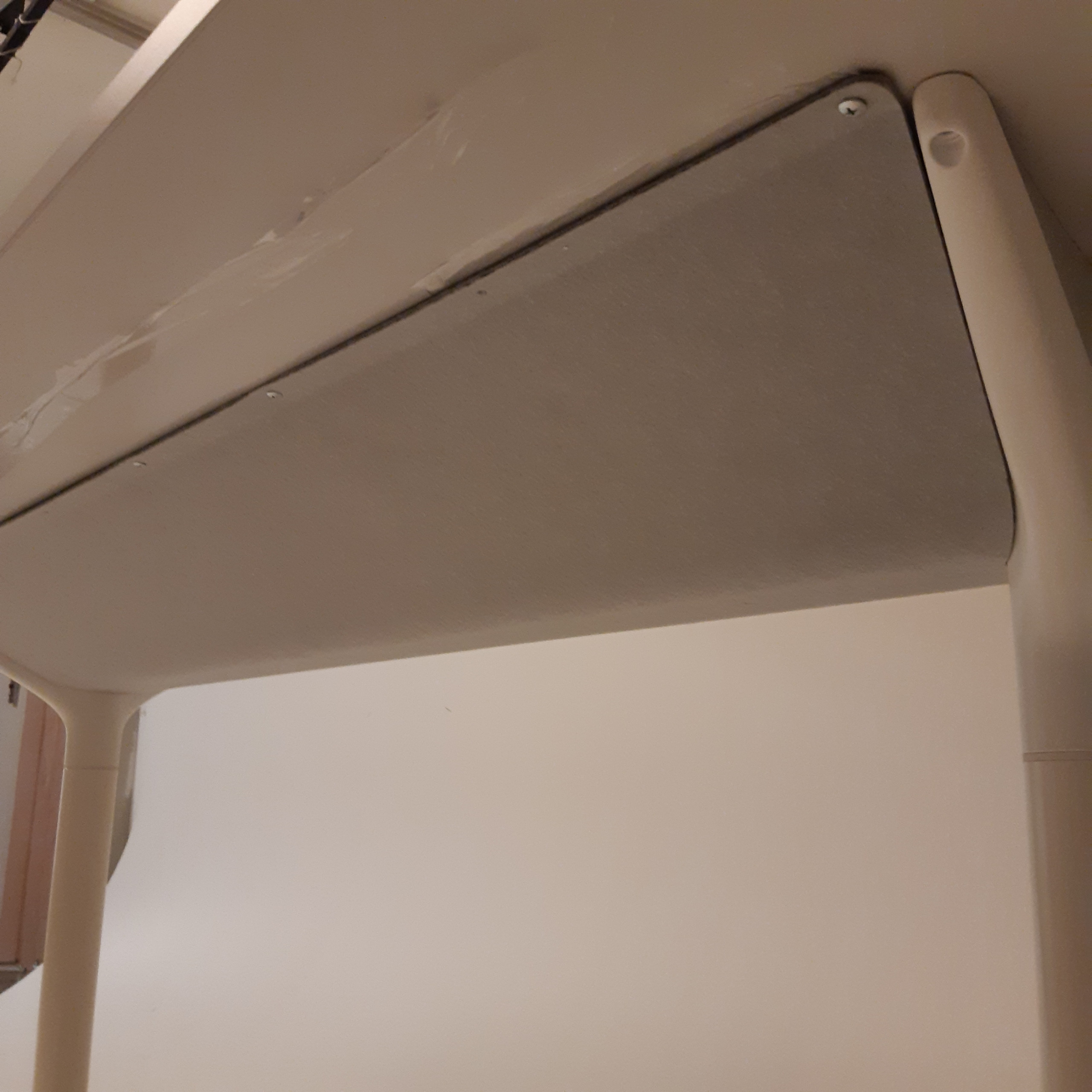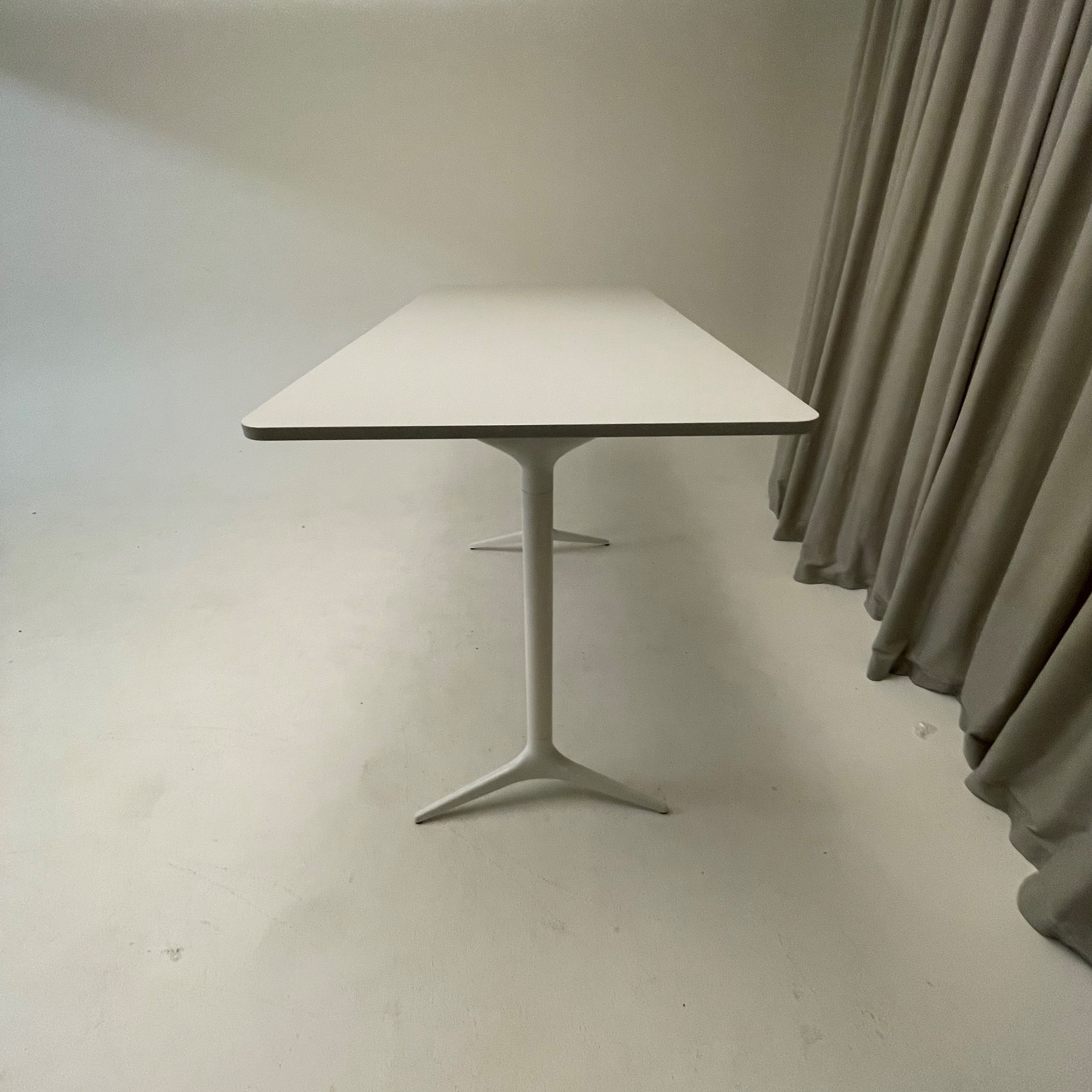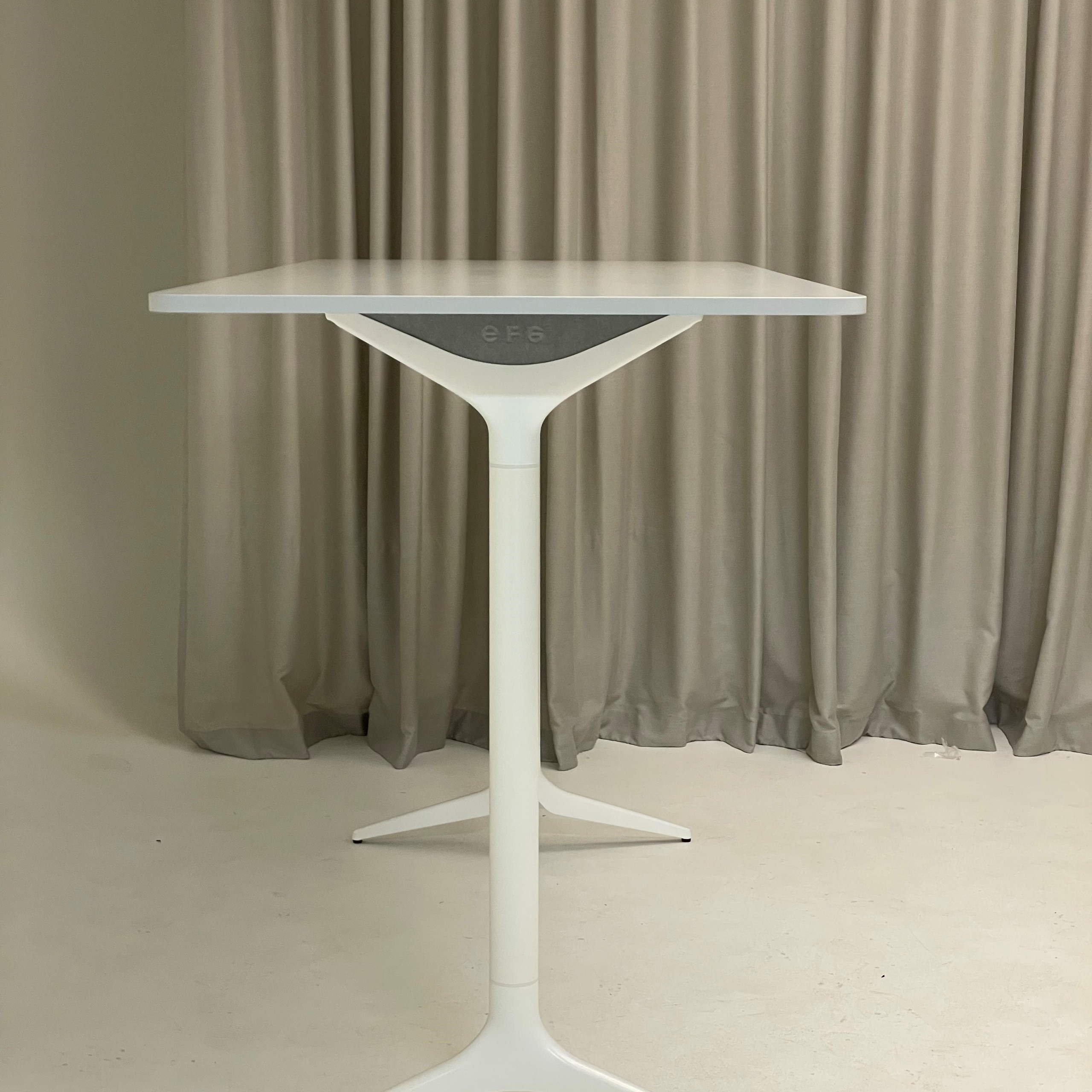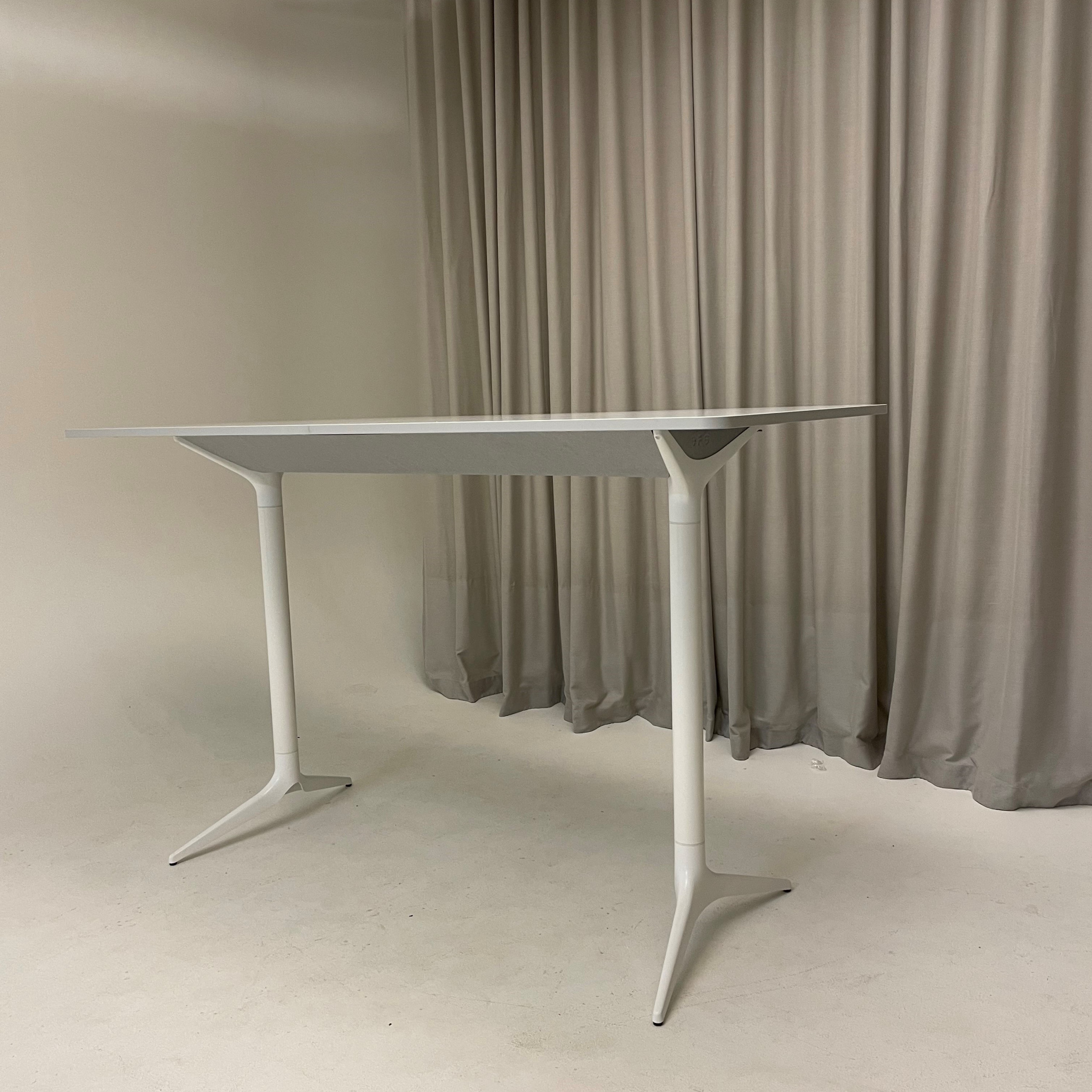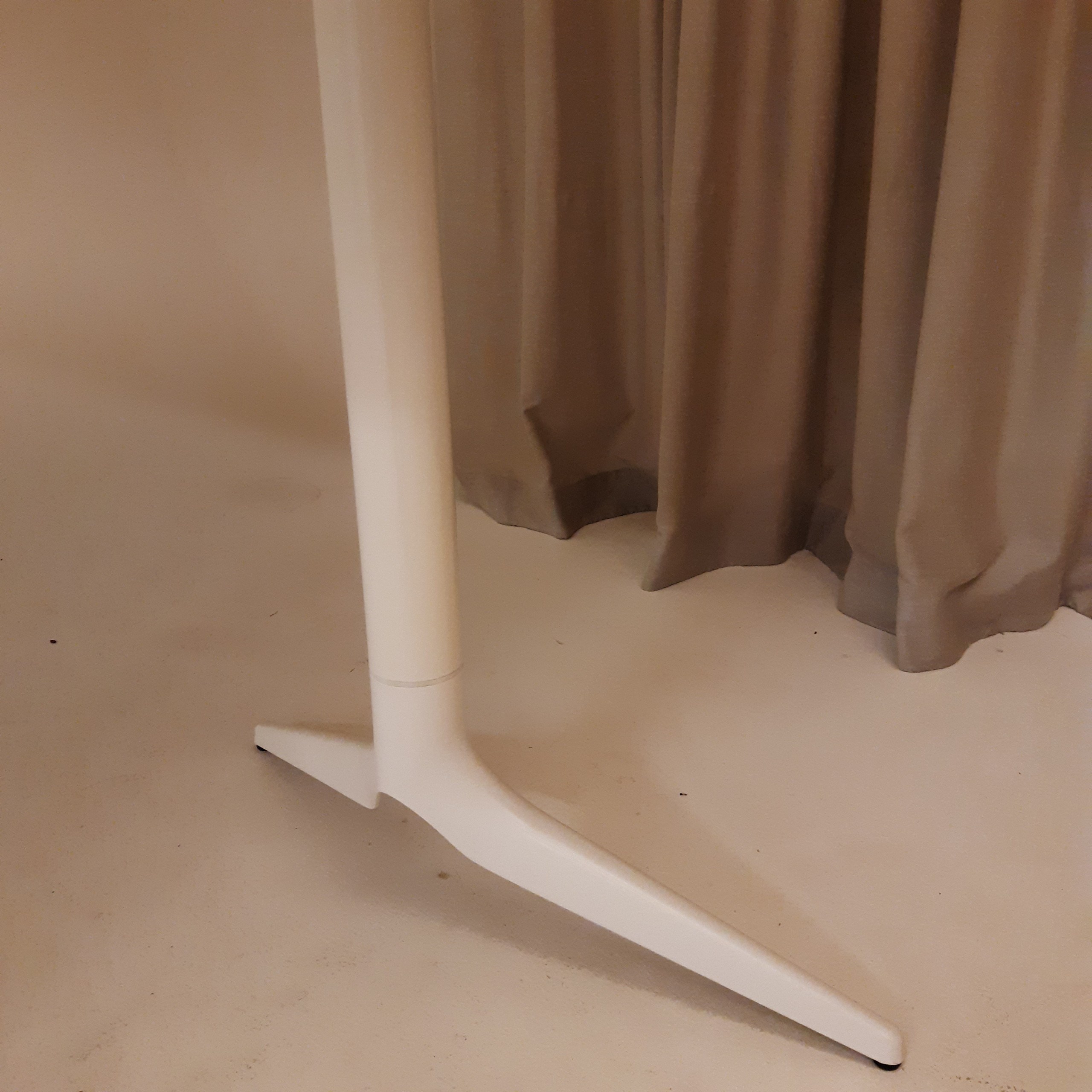 Tabletop in laminate (grey). Base in metal (white).