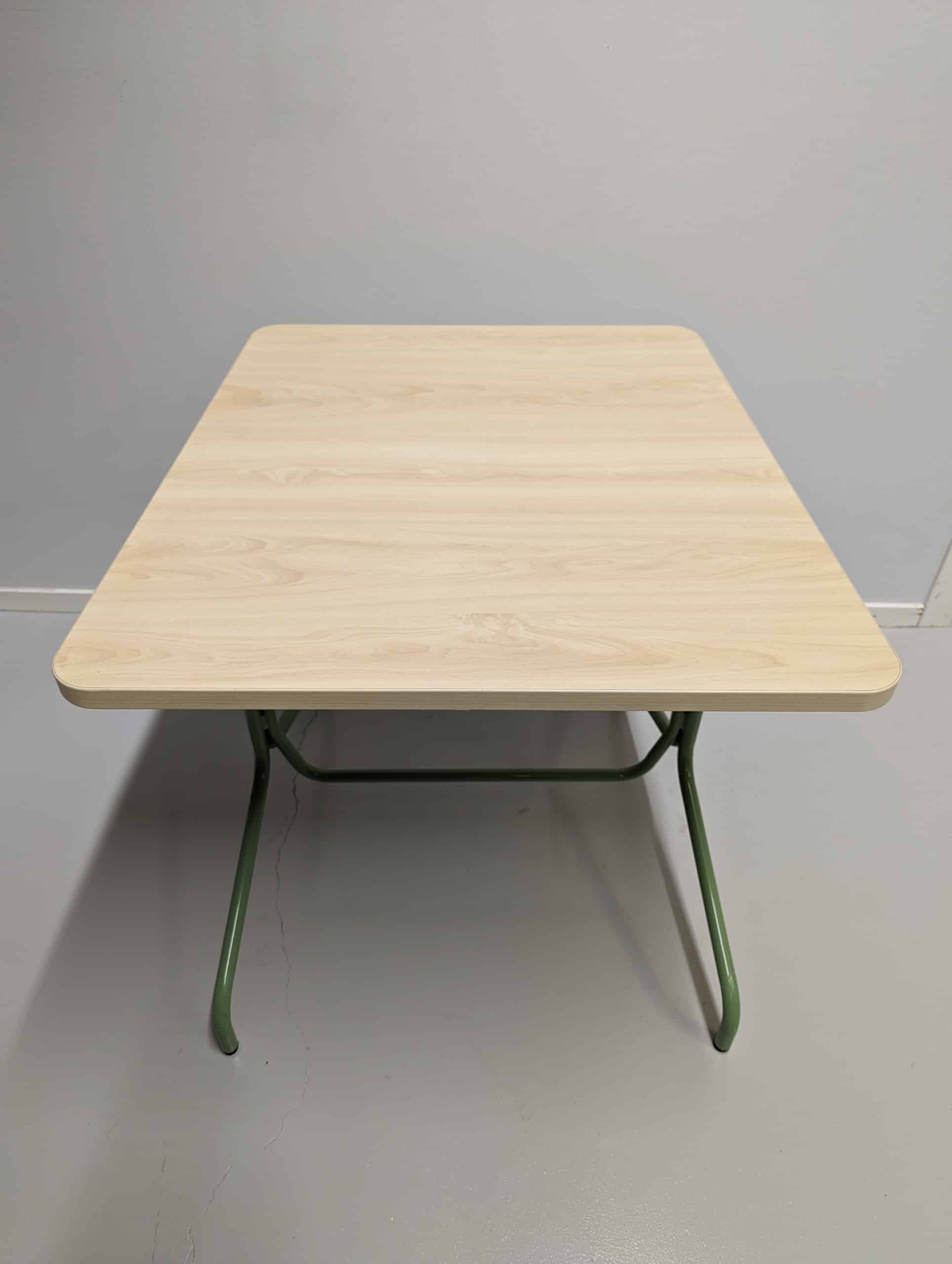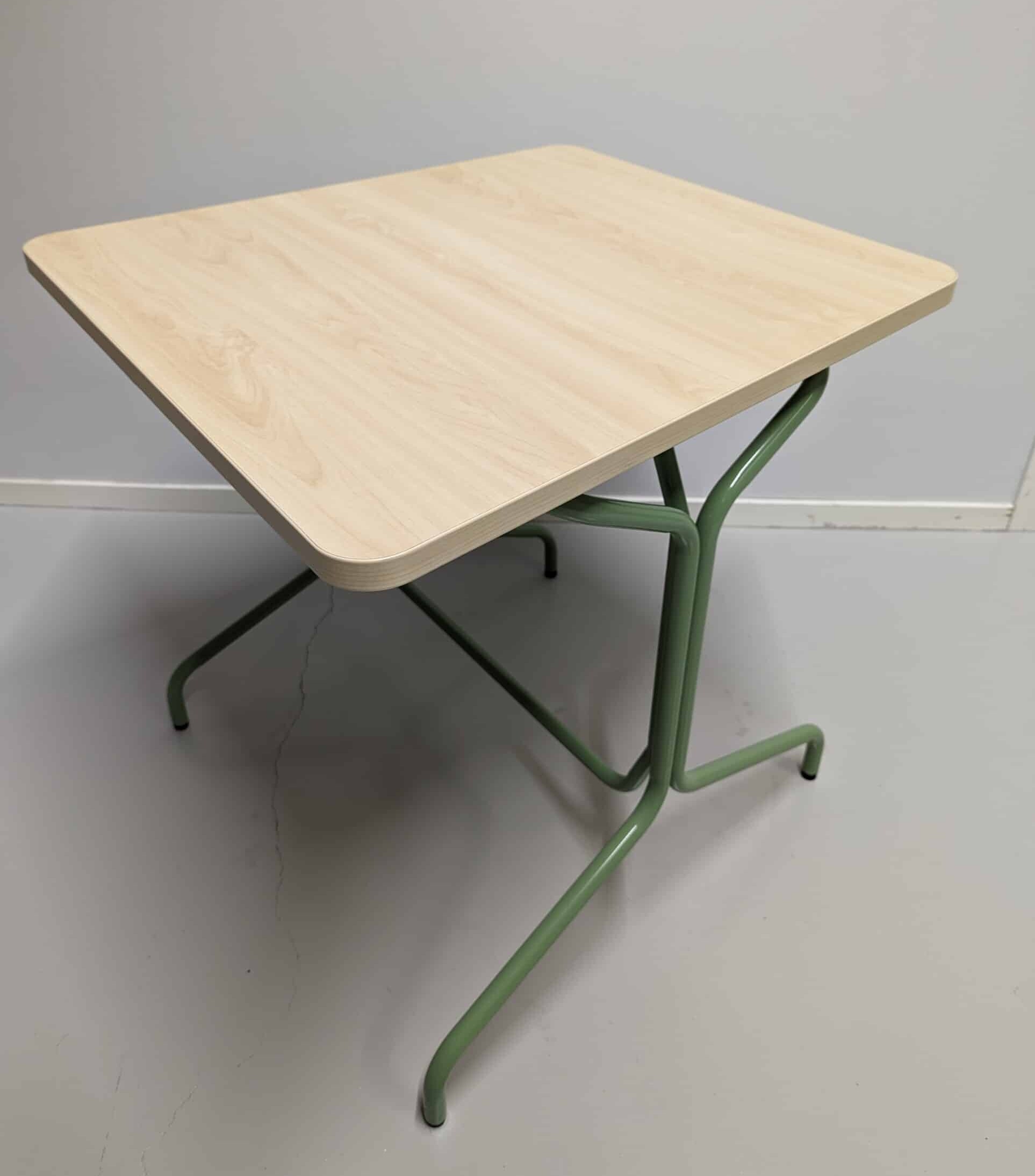 Tabletop in laminate (birch). Base in metal (green).