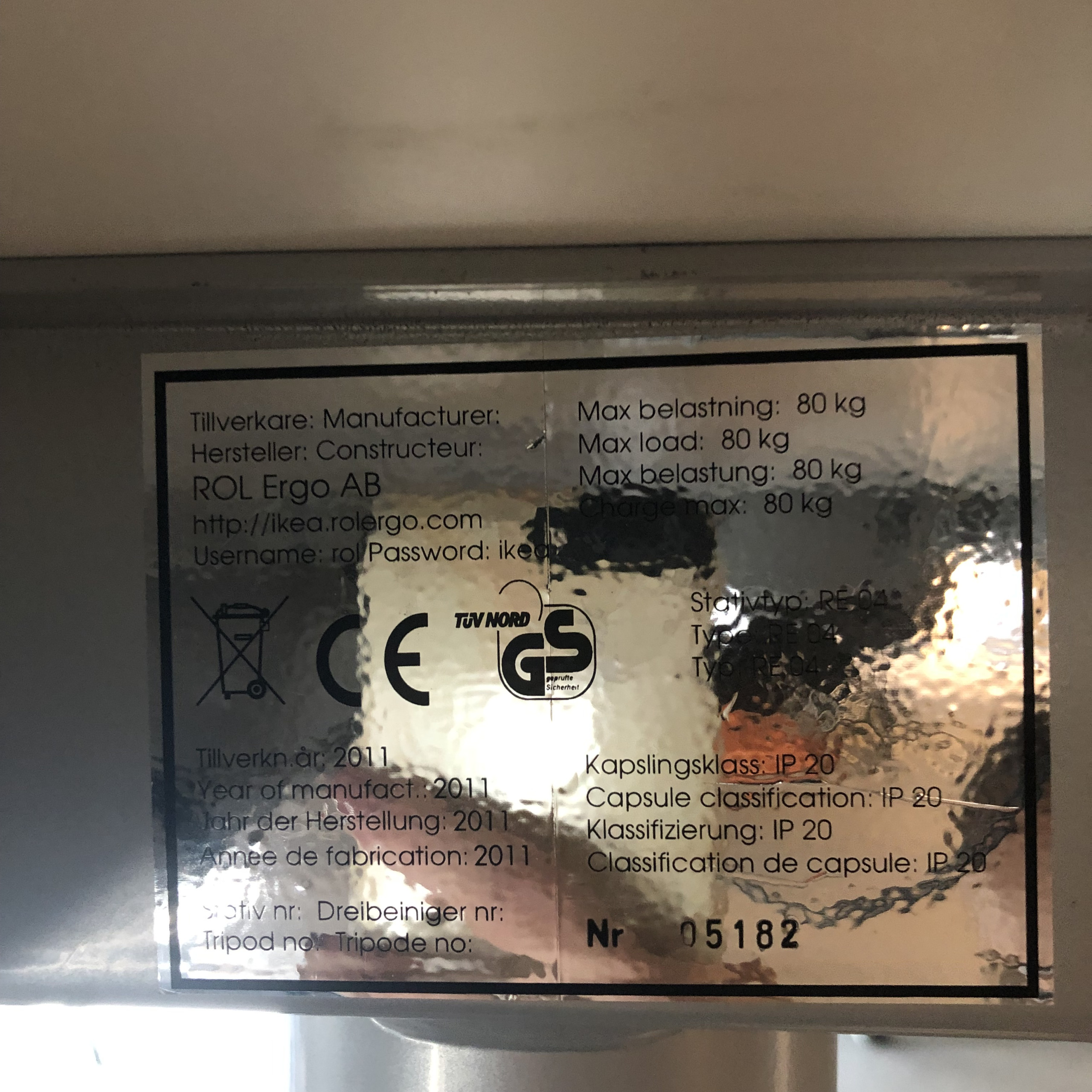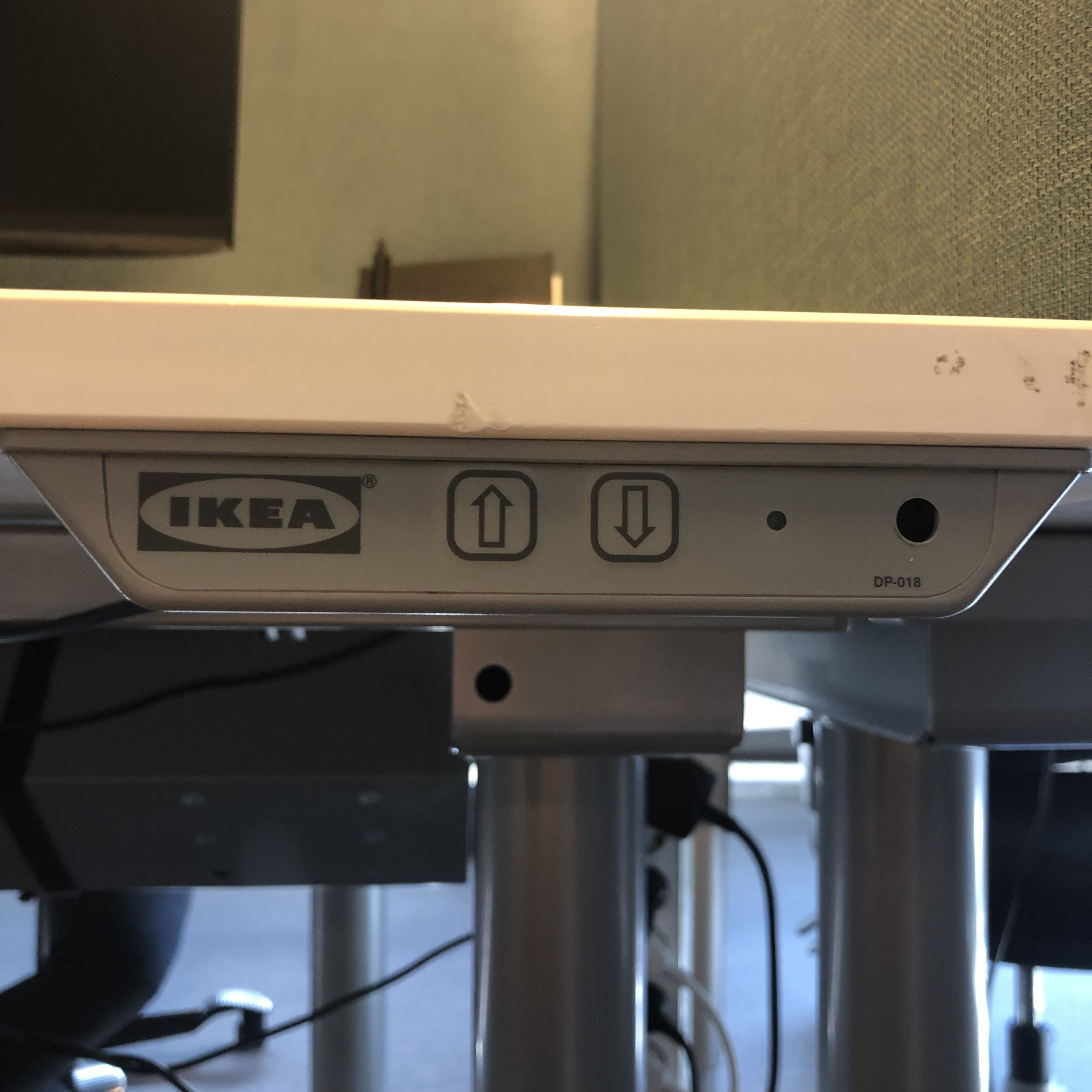 Tabletop in laminate (white). Base in metal (grey). Height adjustable.