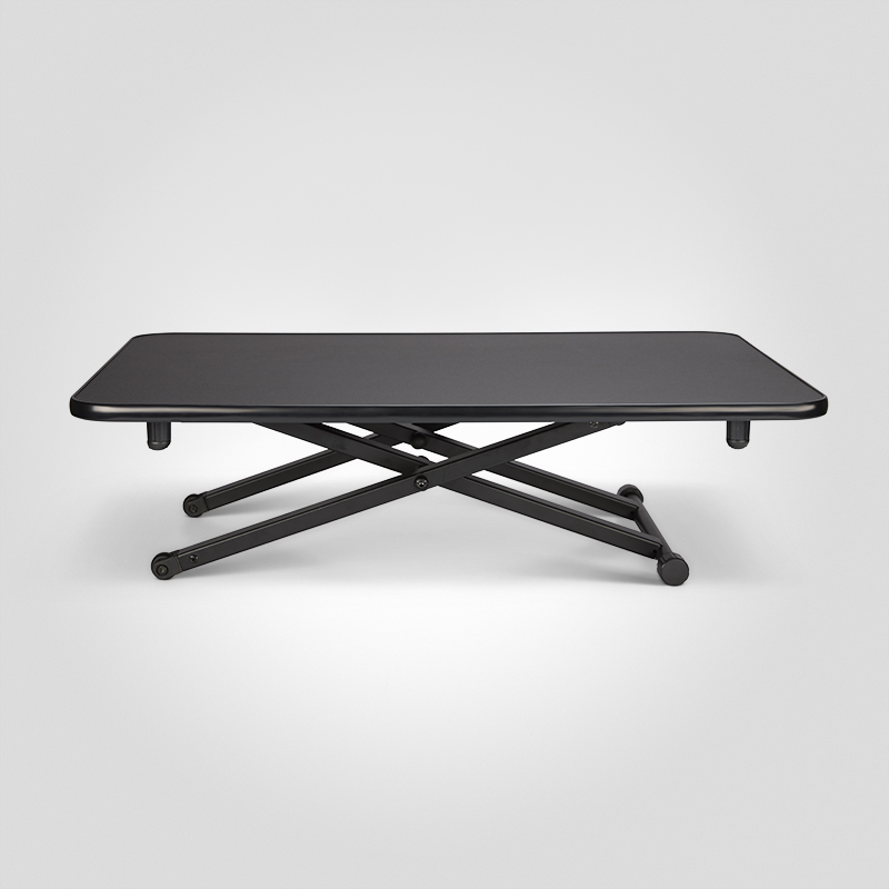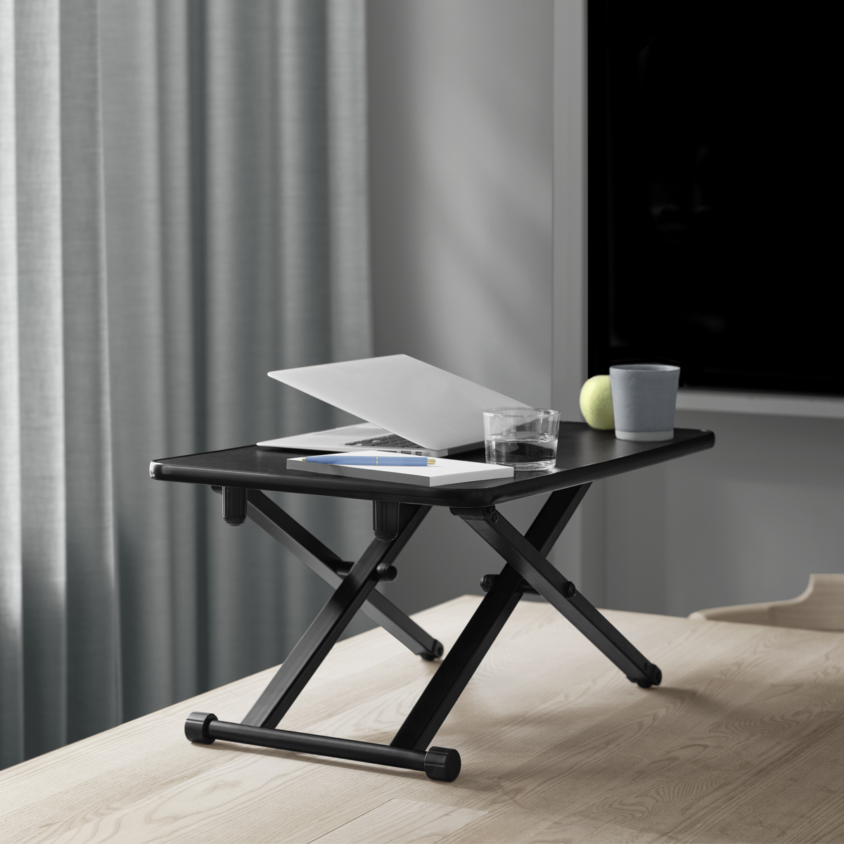 Tabletop in laminate (black). Base in metal (black). Height adjustable.